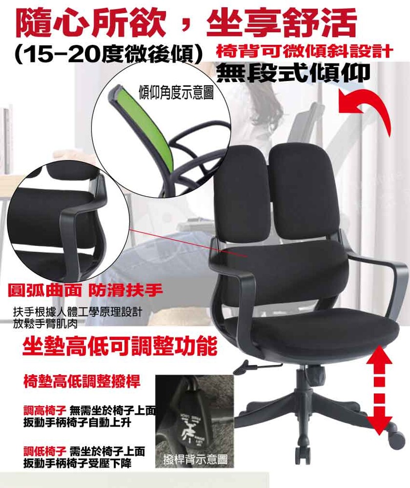 辦公椅搭配採用無段微傾後仰&坐墊高度調整等機能性設計