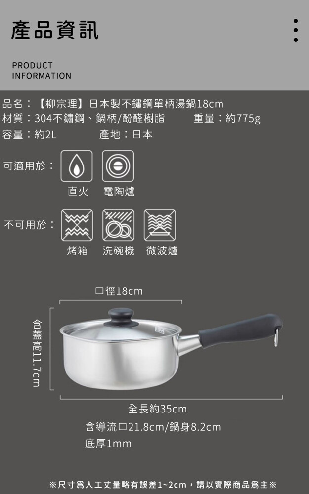尺寸:約35x21.8x11.7/口徑約18cm/底厚1mm /鍋身高8.2cm