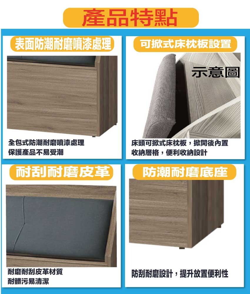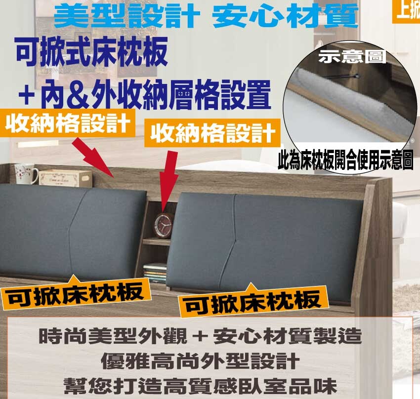 搭配床頭採用可掀式床枕板+內&外收納空間等收納空間設計