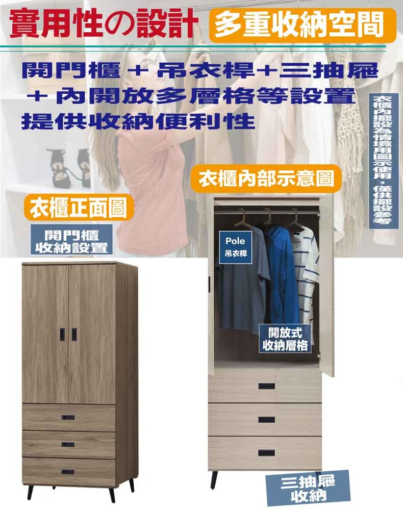搭配採用開門櫃+吊衣桿+三抽屜+內開放層格等收納空間設計