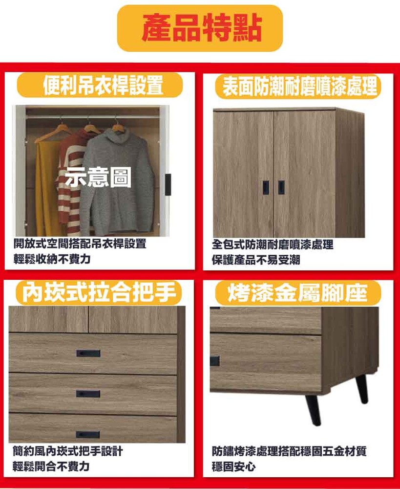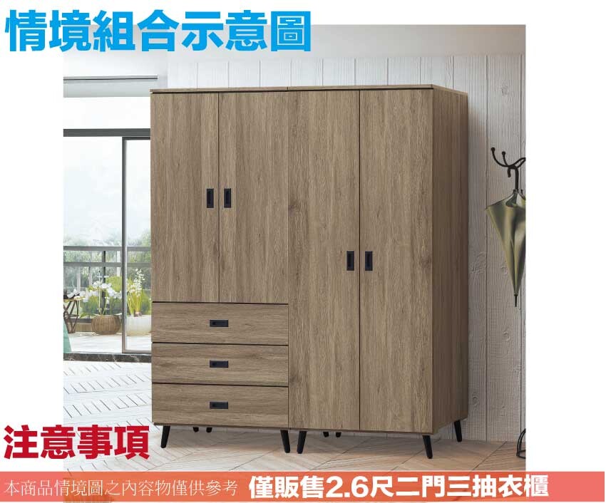 【綠家居】格斯灰橡2.6尺二門三抽衣櫃 灰橡木紋色系+安心材質製造,使用放心+搭配居家更便利,採用防蛀木心板+防潮耐磨底座+五金滑軌結構等安心材質製造 ,外層採用防潮耐磨噴漆處理搭配採用開門櫃+吊衣桿+三抽屜+內開放層格等收納空間設計,全由專人配送到家,專業安心服務,替你省下更多時間!