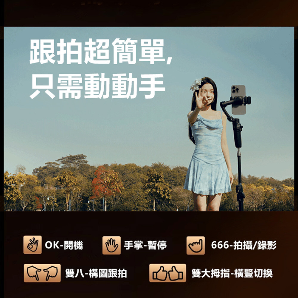 內容物:三軸雲台穩定器,三腳架,磁吸遙控器,AI毫秒追蹤器,充電線