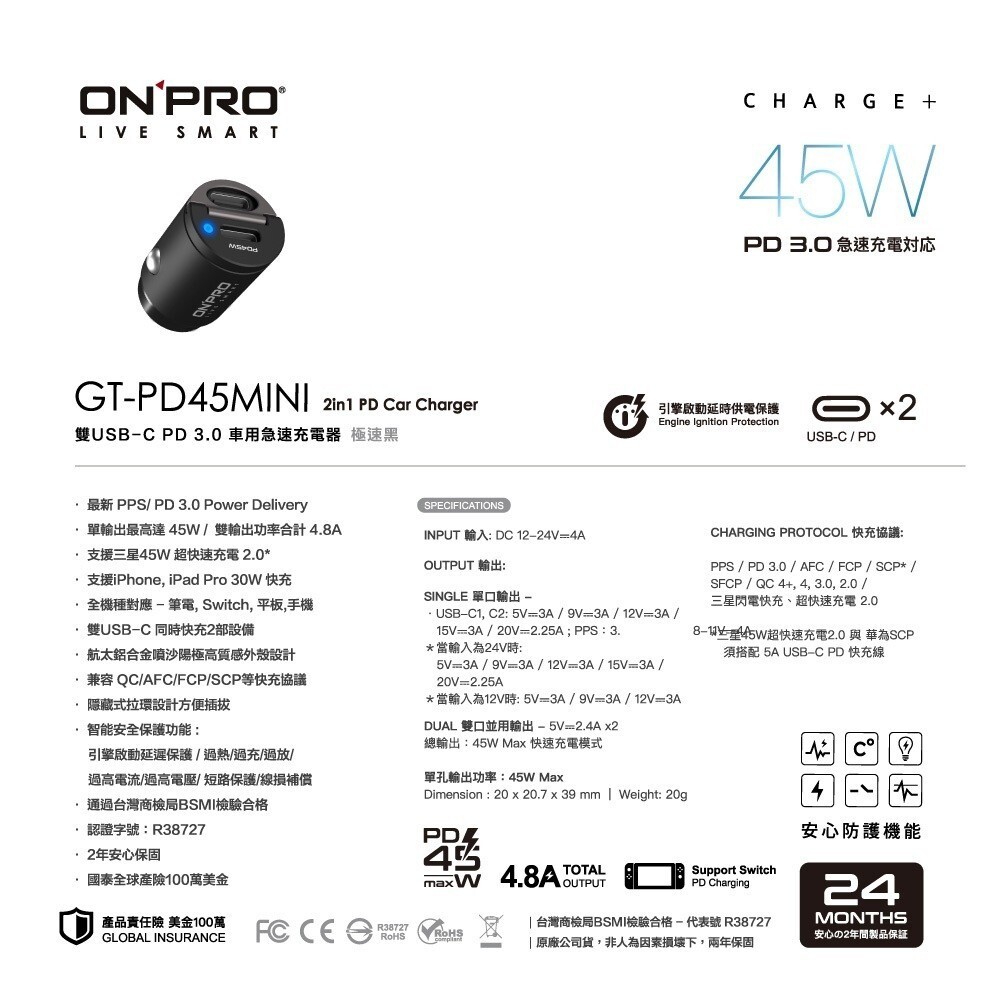 【商品名稱】:GT-PD45AC 雙模式快充 PD+QC3.0 45W超急速車用充電器(紅)