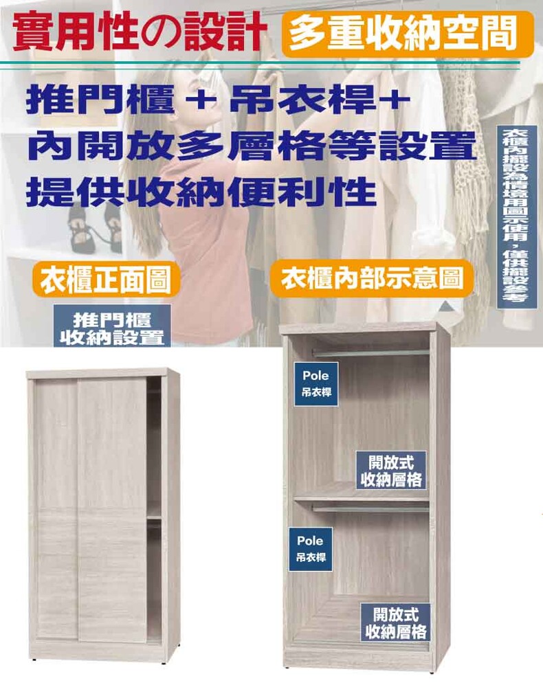 【綠家居】莉斯2.7尺推門衣櫃(三色可選) 三色可選+安心材質製造,使用放心+搭配居家更便利,採用防蛀木心板+防潮耐磨底座+等安心材質製造 ,外層採用防潮耐磨噴漆處理搭配採用推門櫃+吊衣桿+內開放層格等收納空間設計,全由專人配送到家,專業安心服務,替你省下更多時間!
