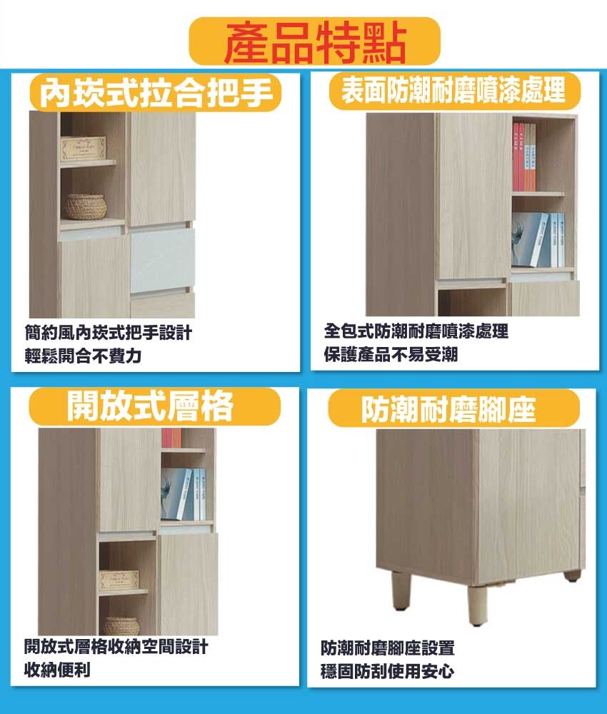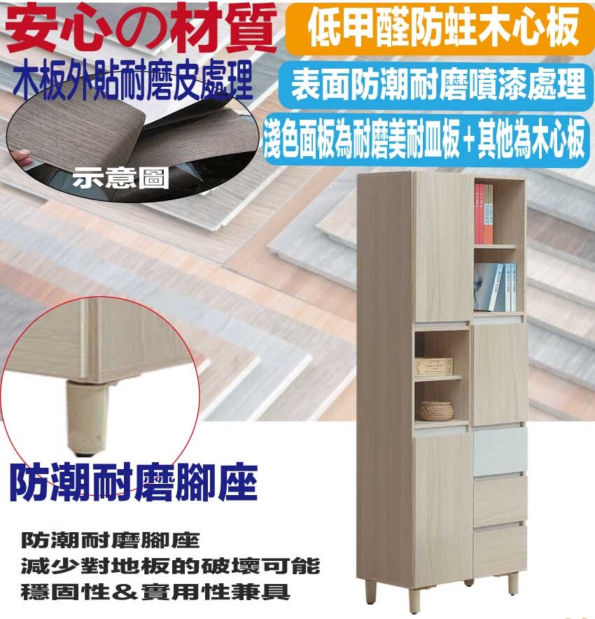 採用防蛀木心板+防潮耐磨腳座+耐磨美耐皿板+五金滑軌結構+防夾手緩衝五金等安心材質製造