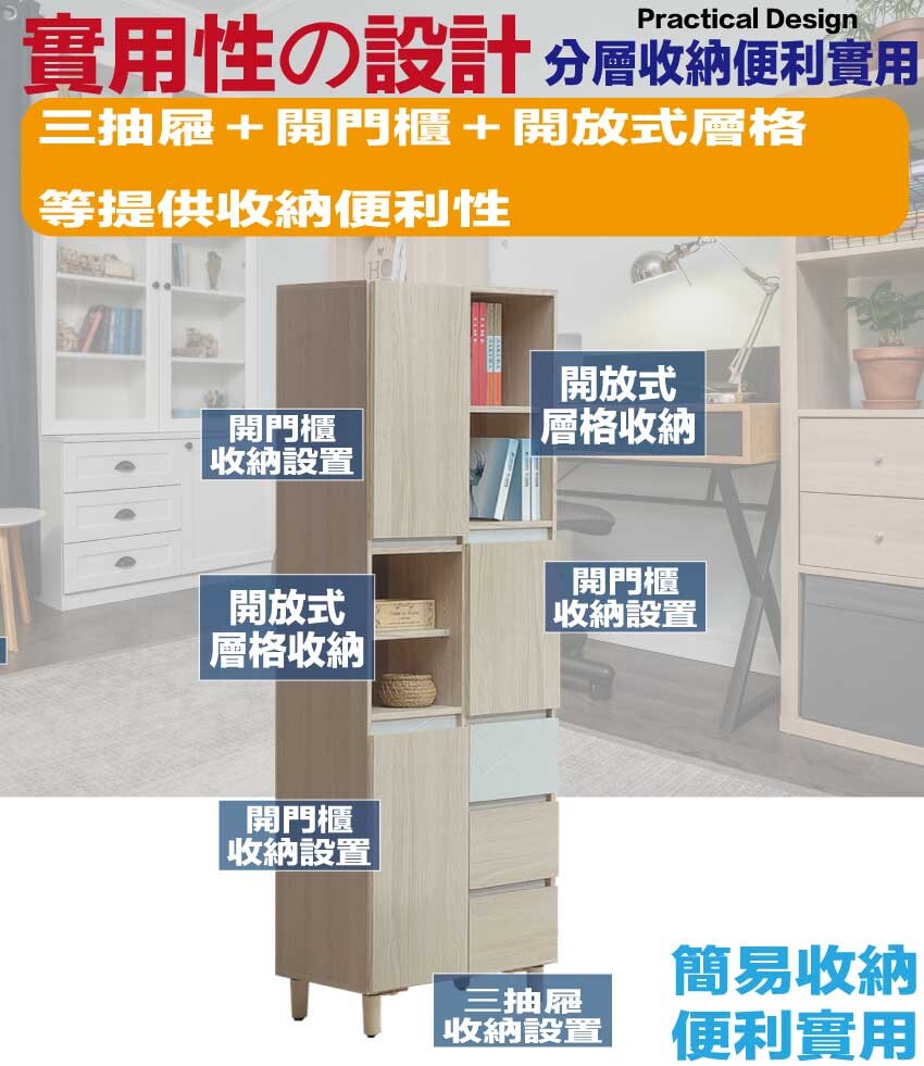 搭配採用開門櫃+三抽屜+開放式層格等收納空間設計