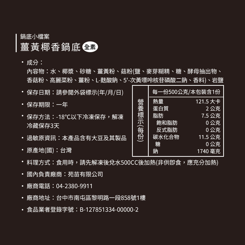 成分:水、椰漿、砂糖、薑黃粉、菇粉(鹽、麥芽糊精、糖、酵母抽出物、香菇粉、高麗菜粉、薑粉、L-麩酸鈉、5'次黃嘌呤核苷磷酸二納、香料)、岩鹽