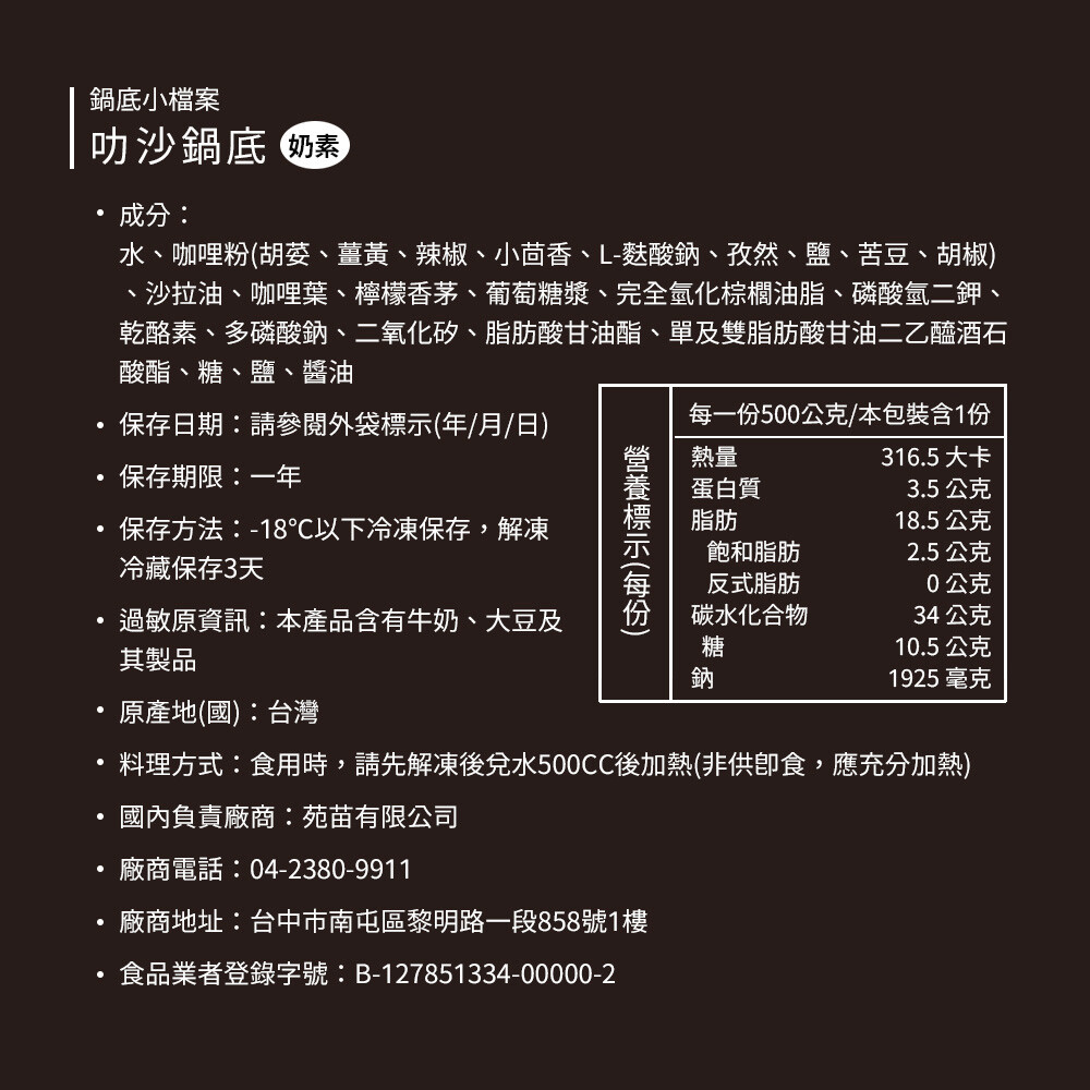 成分:水、咖哩粉(胡荽、薑黃、辣椒、小茴香、L-麩酸鈉、孜然、鹽、苦豆、胡椒)、沙拉油、咖哩葉、檸檬香茅、葡萄糖漿、完全氫化棕櫚油脂、磷酸氫二鉀、乾酪素、多磷酸鈉、二氧化矽、脂肪酸甘油酯、單及雙脂肪酸甘油二乙醯酒石酸酯、糖、鹽、醬油
