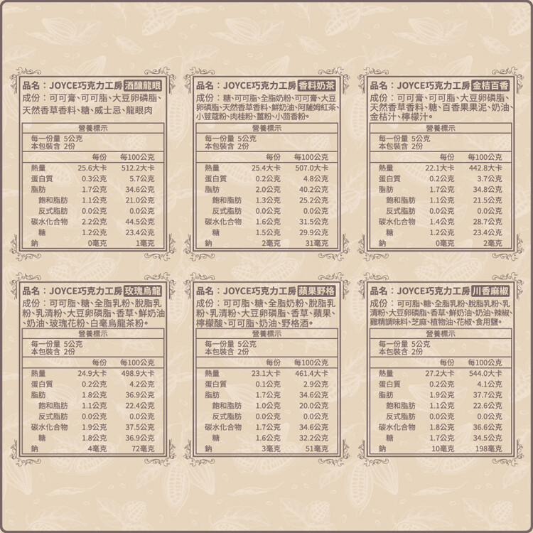 ※川香麻椒-可可脂.糖.全脂乳粉.脫脂乳粉.乳清粉.大豆卵磷脂.香草.鮮奶油.奶油.辣椒.雞精調味料.芝麻.植物油.花椒.食用鹽