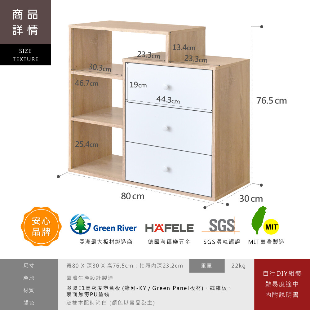 ◎尺寸:寬80 X 深30 X 高76.5 cm;抽屜內深23.2 cm