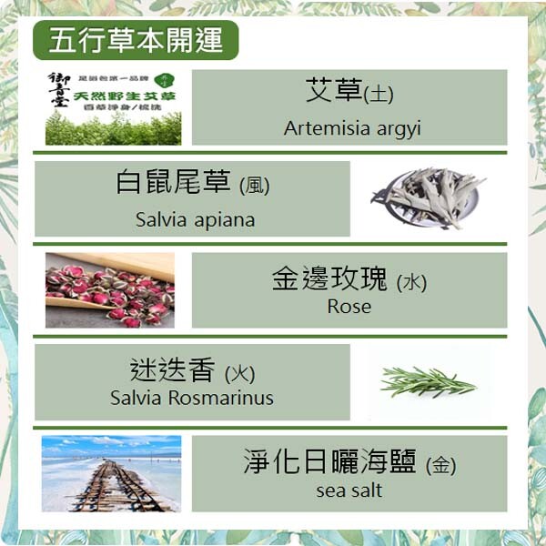 成份:艾草 / 白鼠尾草 /金邊玫瑰 /迷迭香 / 海鹽