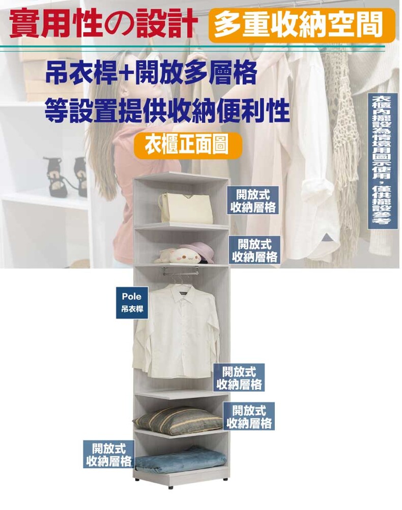 搭配採用吊衣桿+內&外開放多層格等收納空間設計