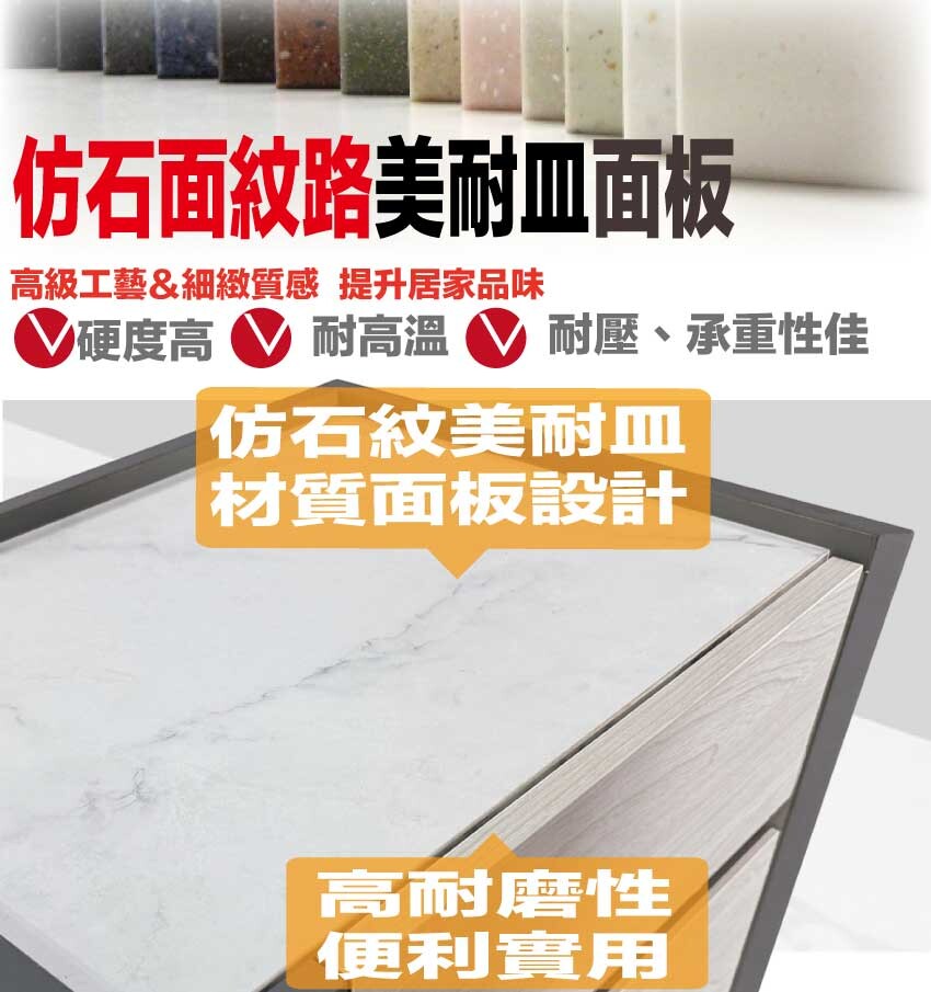 採用防蛀木心板+烤漆金屬腳座+五金滑軌結構+仿大理石紋美耐皿材質桌面板等安心材質製造