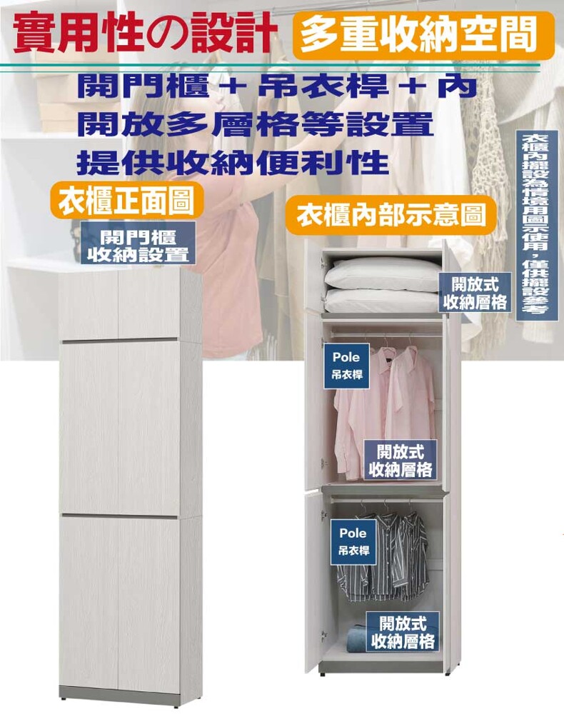 搭配採用開門櫃+吊衣桿+內開放多層格等收納空間設計