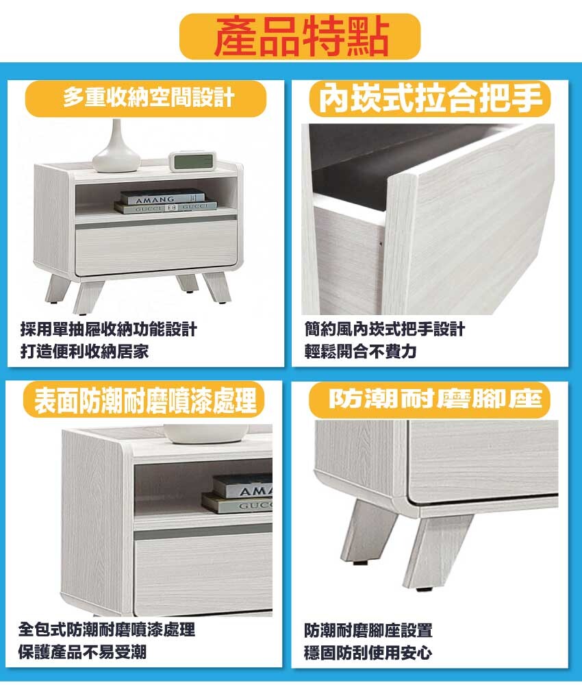 【綠家居】泰格1.7尺單抽床頭櫃 木紋雙色系+安心材質製造,使用放心+搭配居家更便利,採用防蛀木心板+防潮耐磨底座+五金滑軌結構等安心材質製造 ,外層採用防潮耐磨噴漆處理搭配採用單抽屜+開放層格等收納空間設計,全由專人配送到家,專業安心服務,替你省下更多時間!