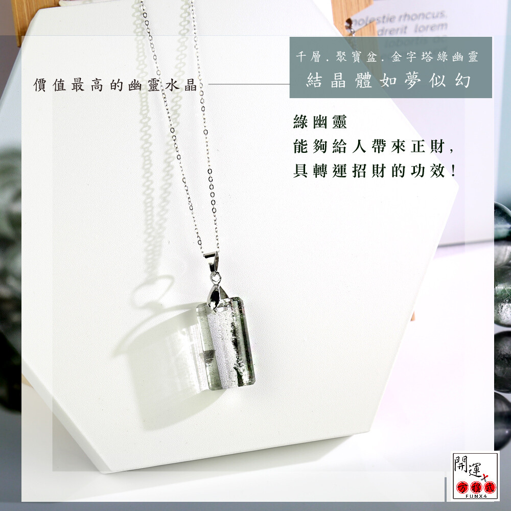 綠色位於光譜中間,最平衡的顏色,壓力大時可以運用配戴綠幽靈達到放鬆心情,綠色對應脈輪第四輪"心輪",對於心、肺、淋巴腺等有療癒的能量作用。