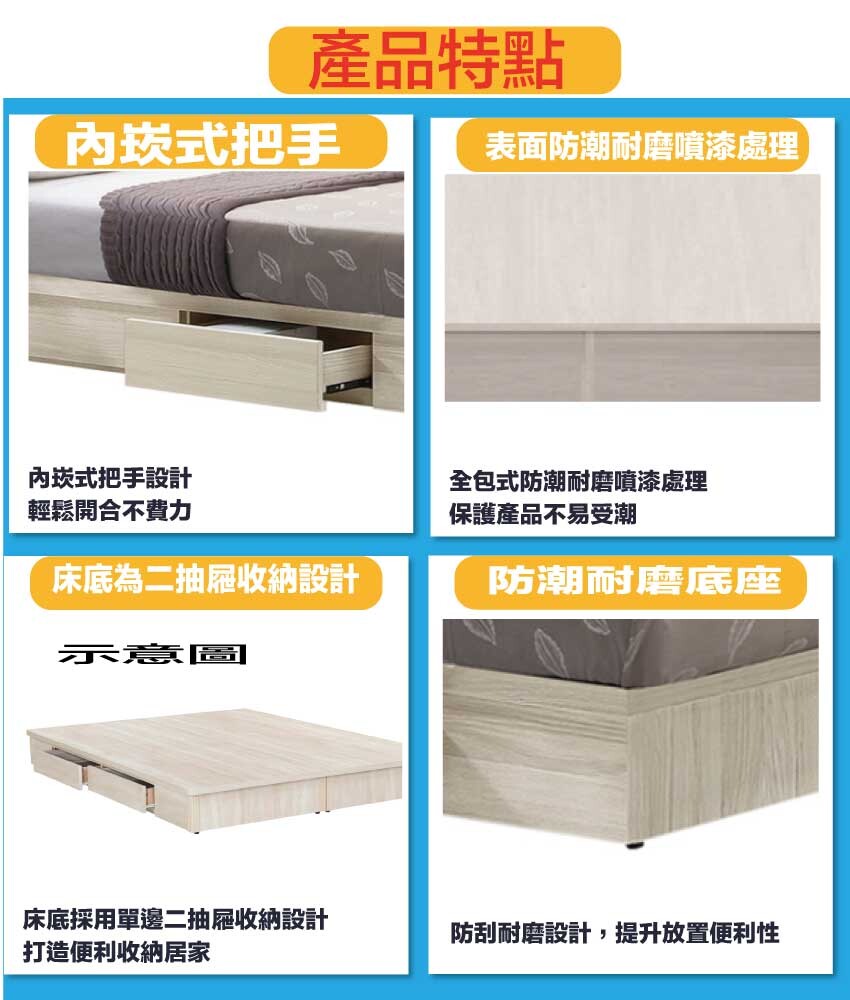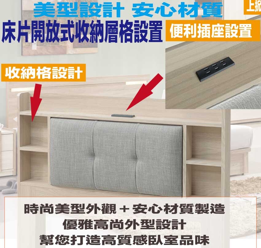 搭配床頭開放收納層格+便利插座設置+床底座單邊開合二抽屜等收納空間設計