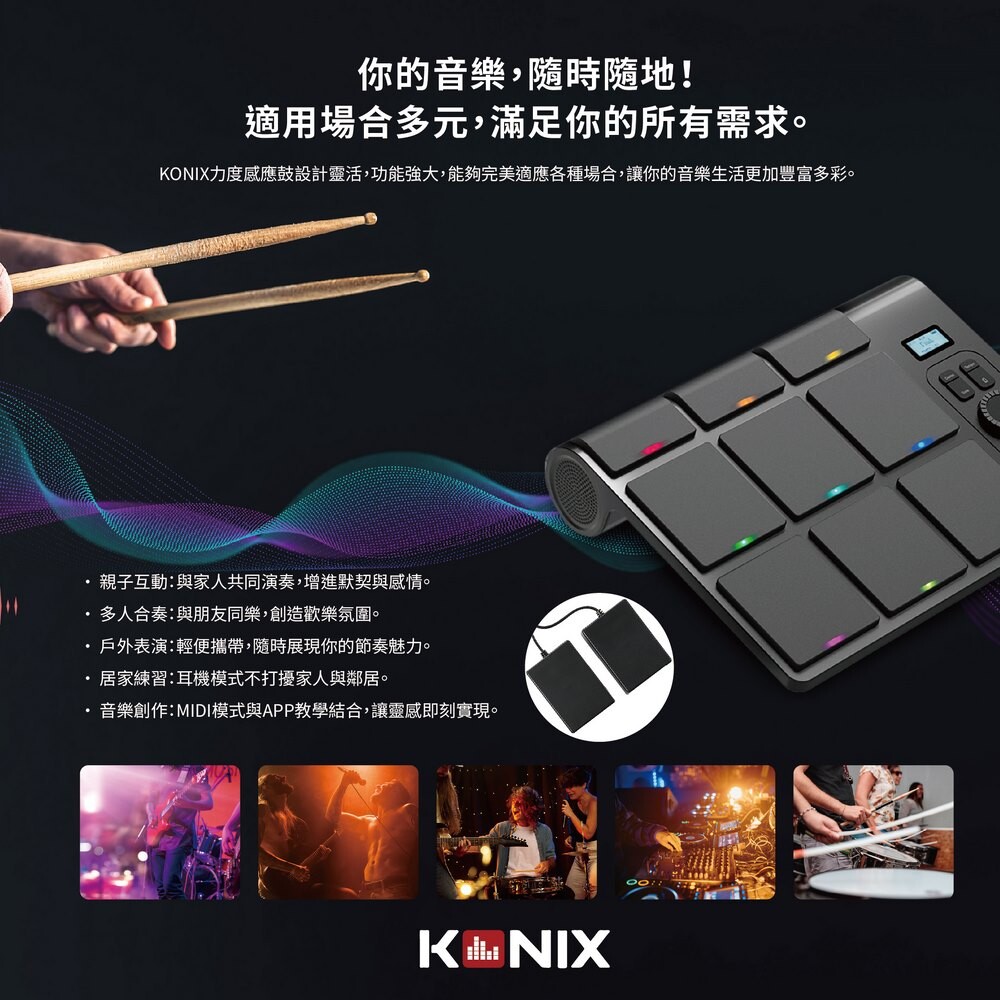 KONIX科尼斯樂器,力度感應電子鼓,適用場合多元