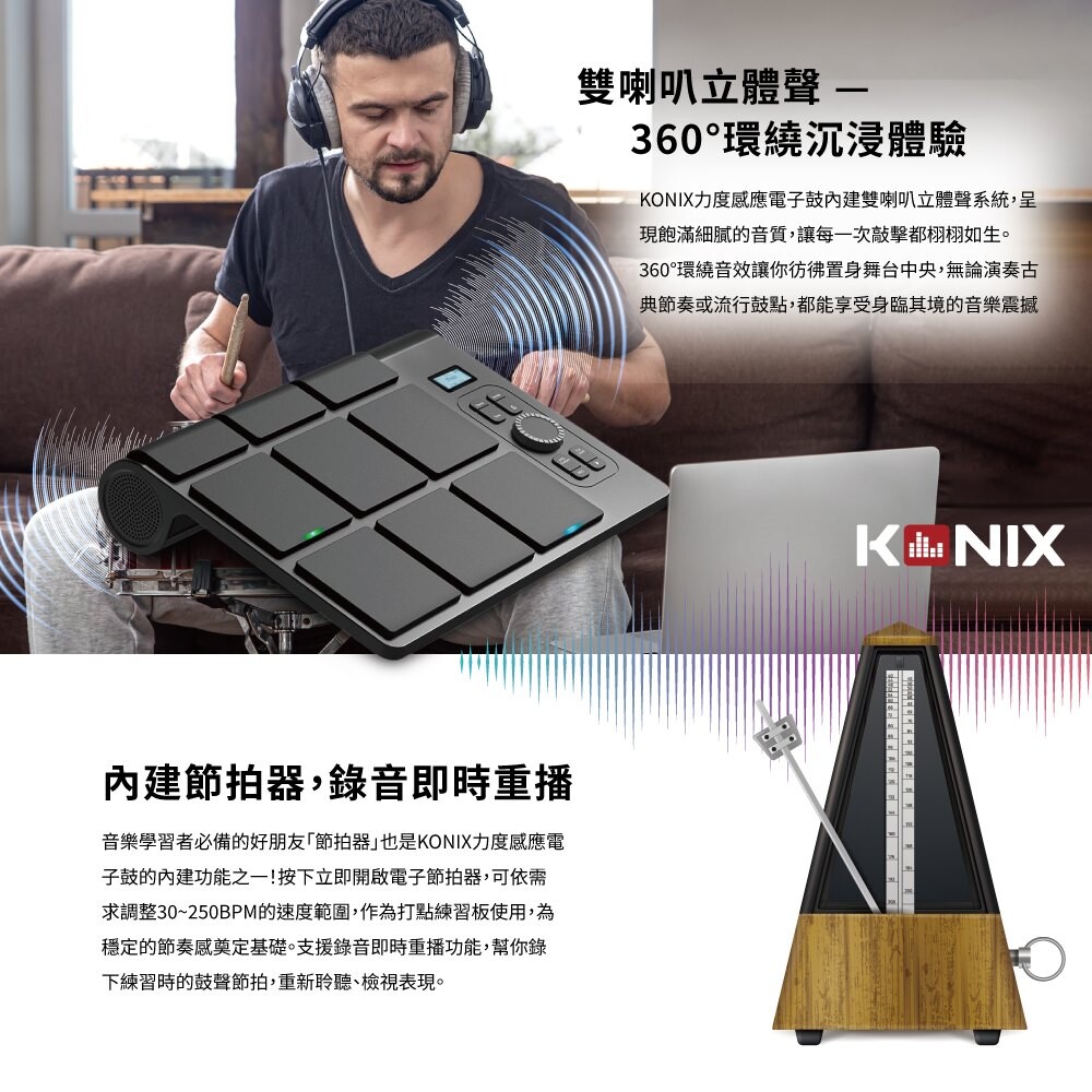KONIX科尼斯樂器,力度感應電子鼓,節拍器,錄音,打鼓練習