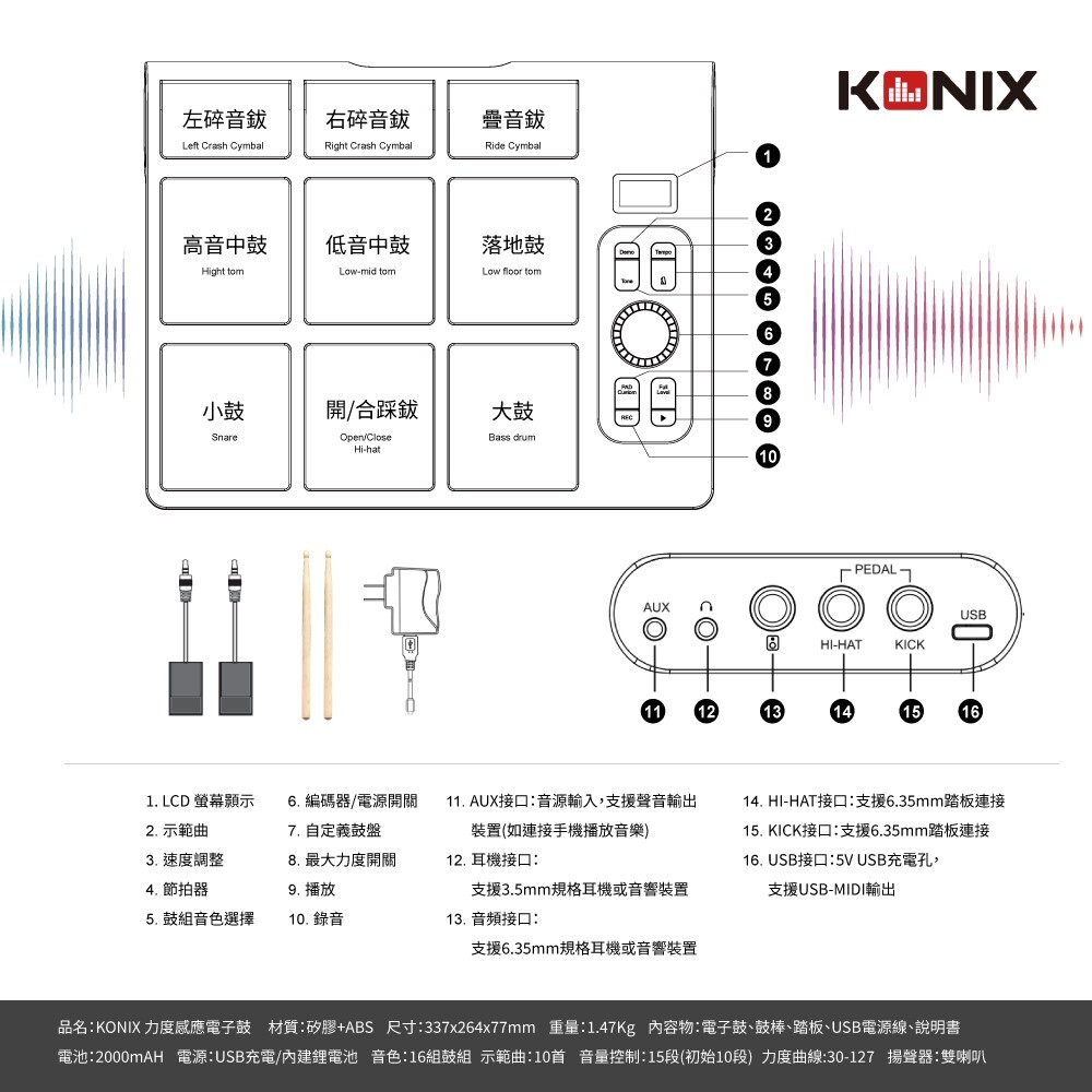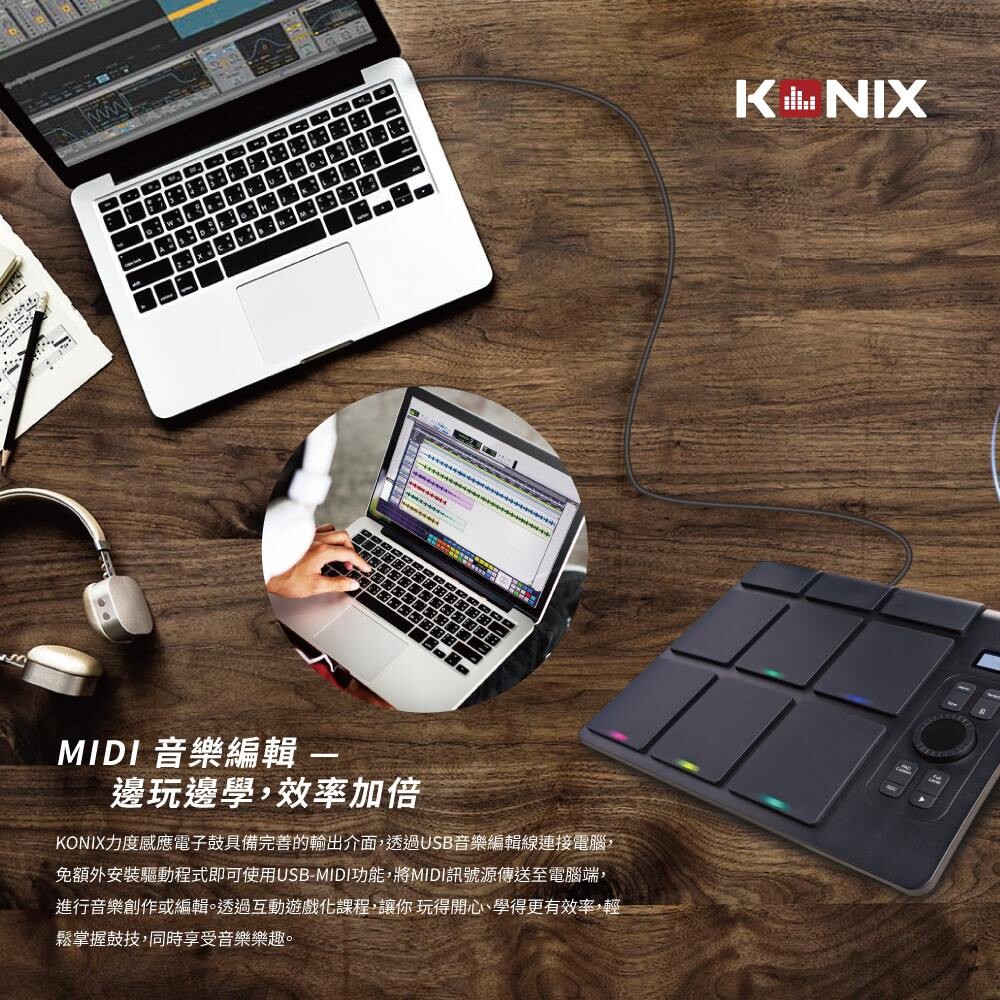 KONIX科尼斯樂器,力度感應電子鼓,USB-MIDI音樂編輯,外接耳機,打鼓練習