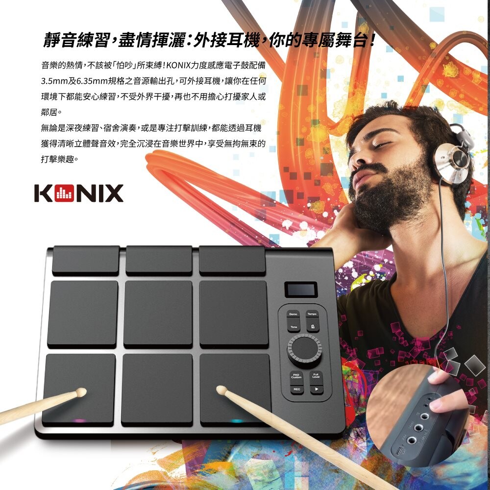 KONIX科尼斯樂器,力度感應電子鼓,外接耳機