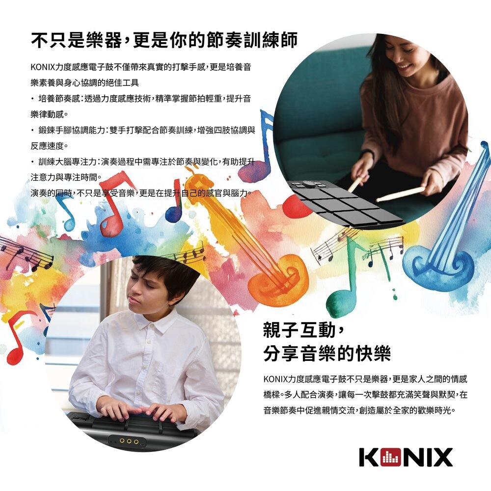 KONIX力度感應電子鼓不僅帶來真實的打擊手感,更是培養音樂素養與身心協調的絕佳工具