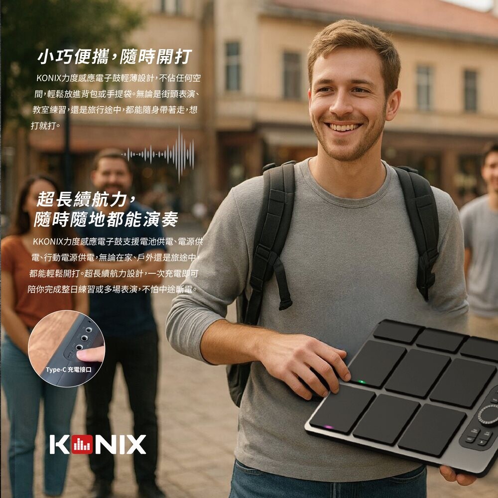 不論你是街頭表演、音樂教學,還是居家練習,KONIX力度感應電子鼓都能為你帶來真實鼓感與專業音色。透過力度感應技術,敲擊輕重即能精準還原鼓聲細節,讓每一次擊打都充滿層次。