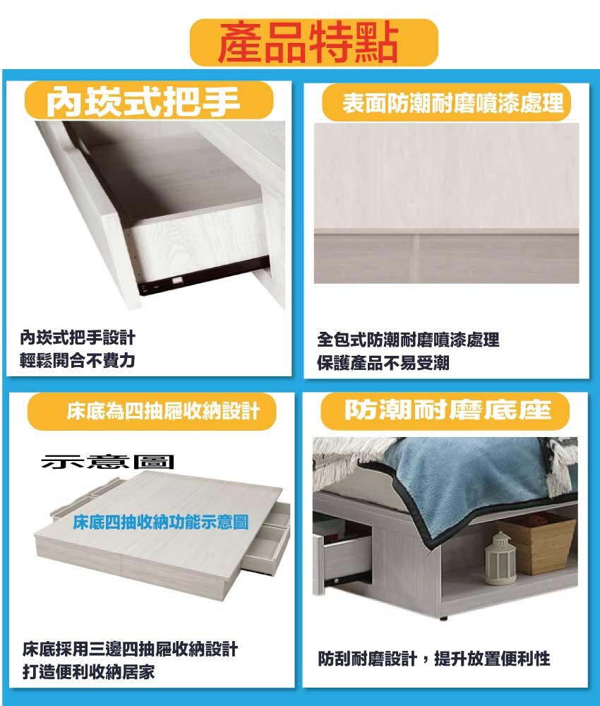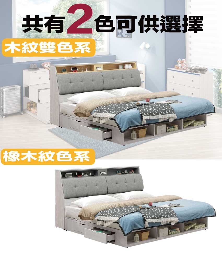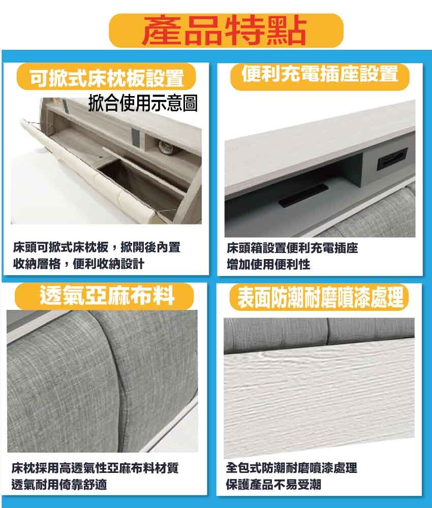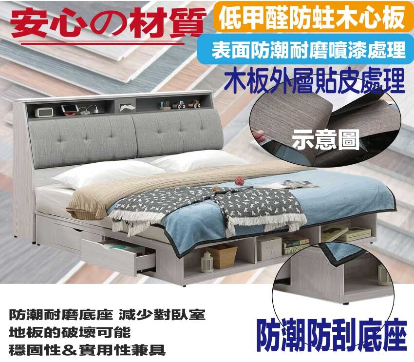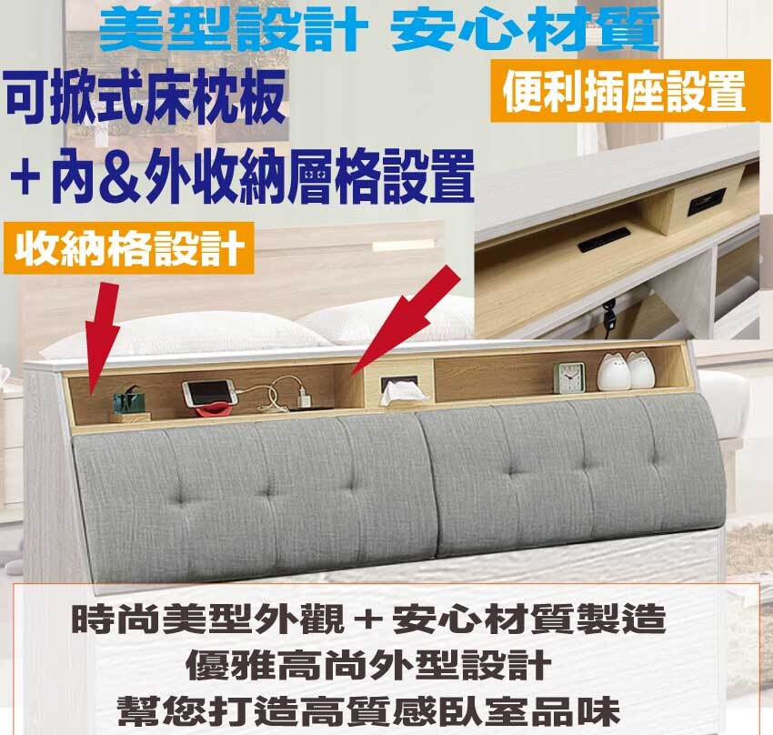 搭配床頭可掀式床枕板+內&外開放收納層格+便利插座設置+床底座雙邊開合四抽屜等收納空間設計