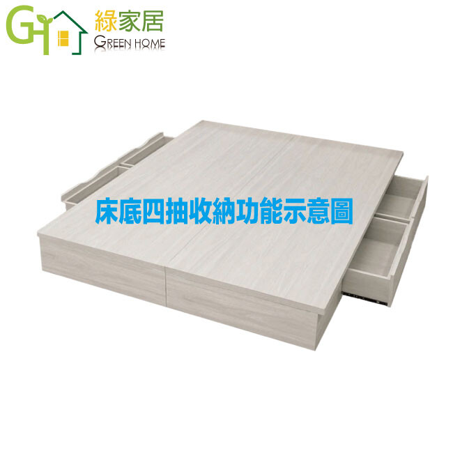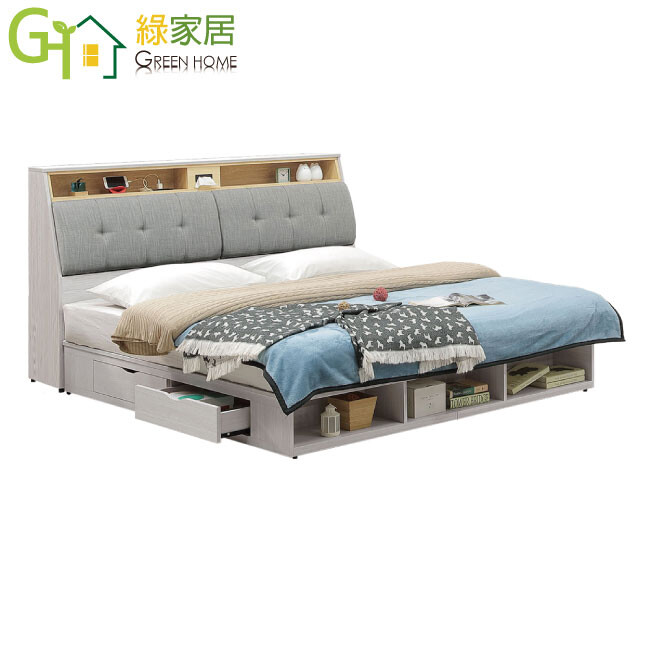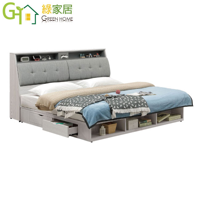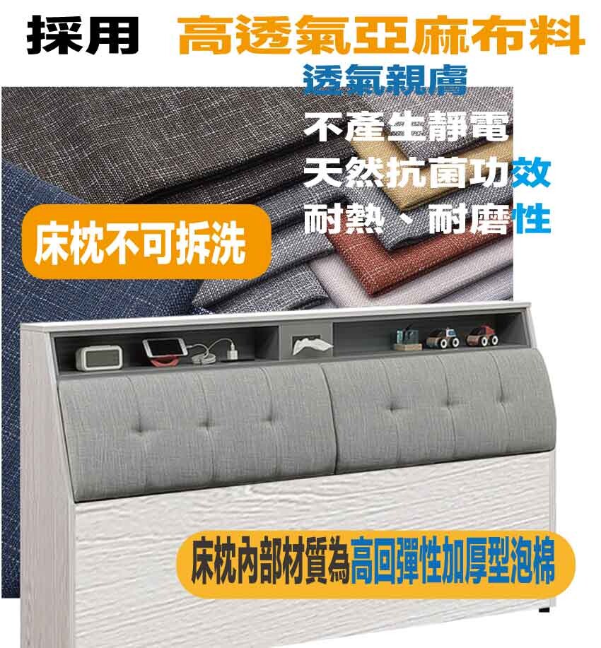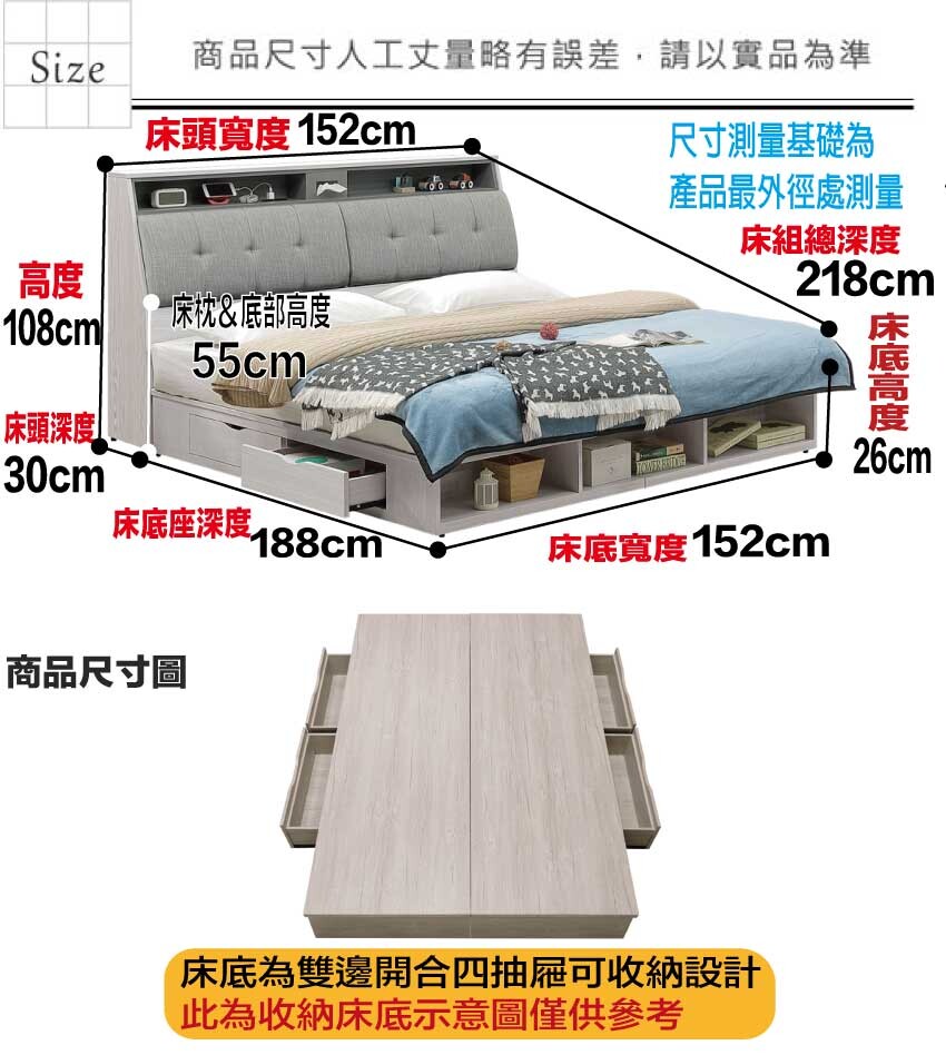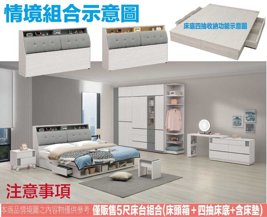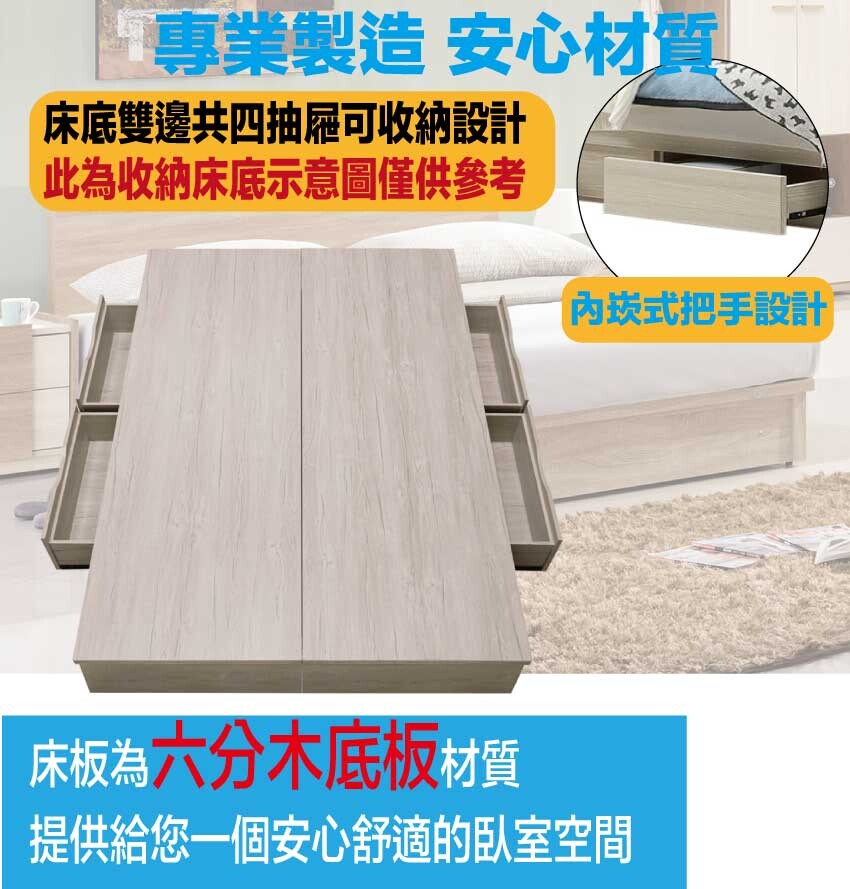 搭配床頭可掀式床枕板+內&外開放收納層格+便利插座設置+床底座雙邊開合四抽屜等收納空間設計