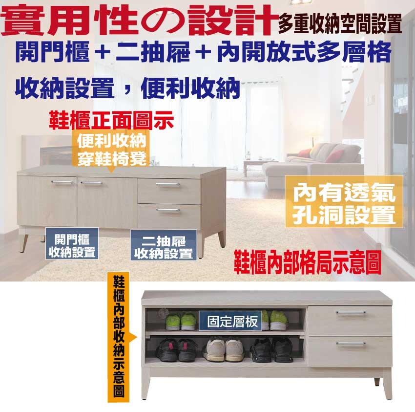 【綠家居】夏沐4尺二門二抽座鞋櫃 淺橡木紋色系+安心材質製造,使用放心+搭配居家更便利,採用防蛀木心板+實木防刮腳座+防夾手緩衝門片五金+五金滑軌結構等安心材質製造 ,外層採用防潮耐磨噴漆處理搭配採用開門櫃+二抽屜+穿鞋座板等收納空間設計,全由專人配送到家,專業安心服務,替你省下更多時間!