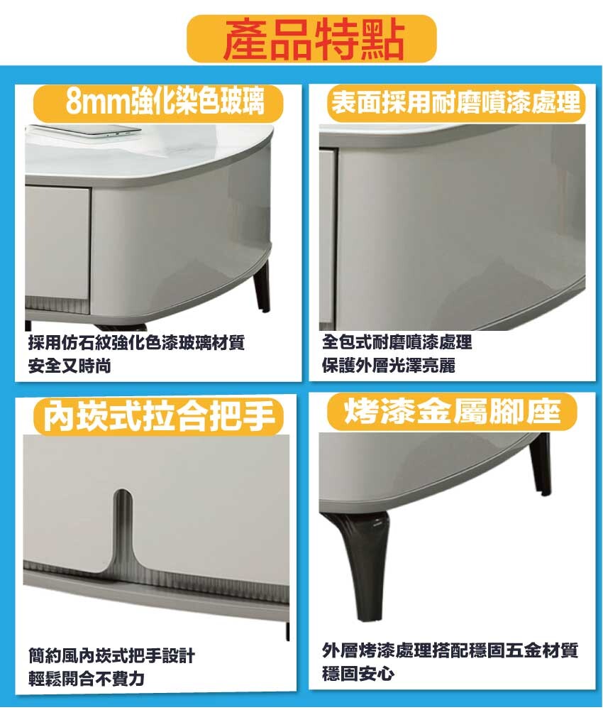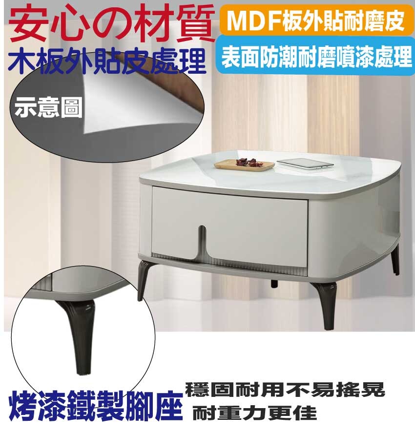 採用防潮MDF板+烤漆鐵製腳座+五金滑軌結構+8mm仿大理石紋強化玻璃桌面板等安心材質製造