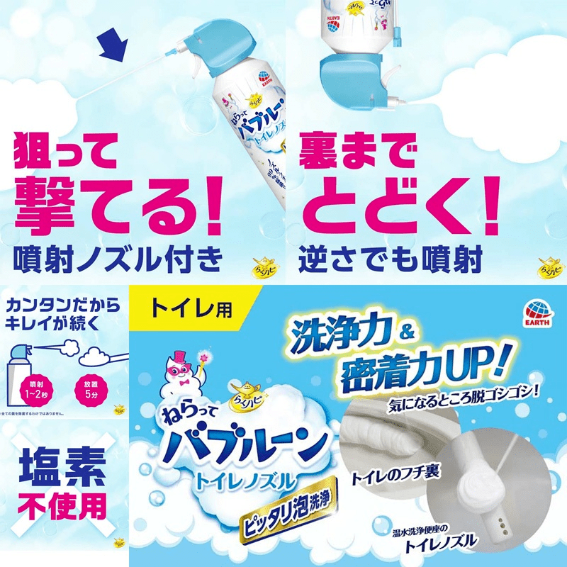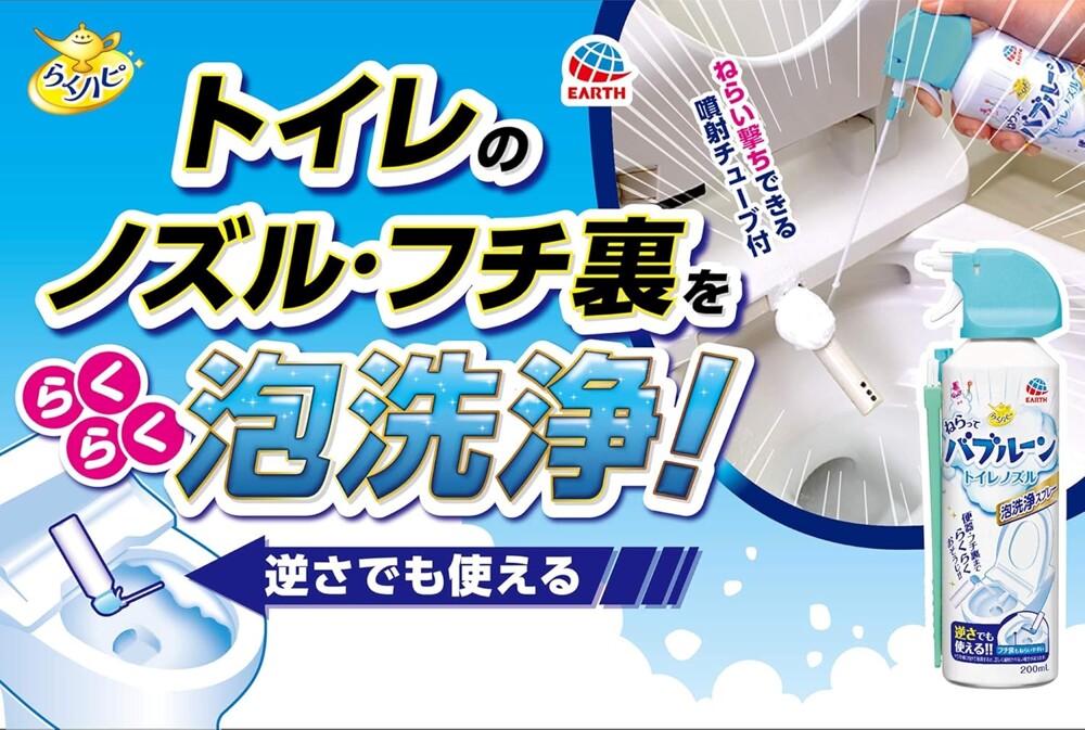 用泡沫浮起廁所噴嘴和馬桶邊緣內側的污垢即可徹底清洗・除菌的噴霧。 附帶可以瞬間擊打的噴射管,反向也可使用,清潔乾淨。