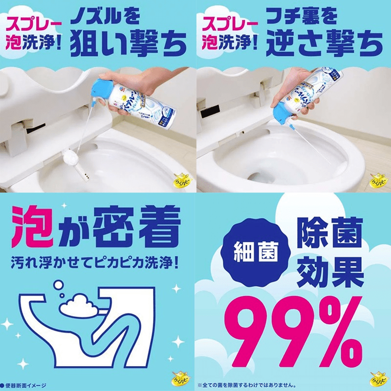 【內側污垢也能徹底清潔】將廁所噴嘴和馬桶邊緣內側的污垢通過泡沫浮起,徹底清潔·除菌噴霧