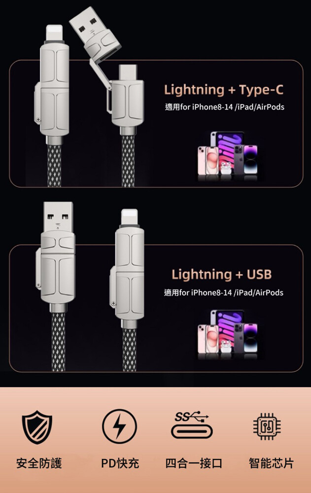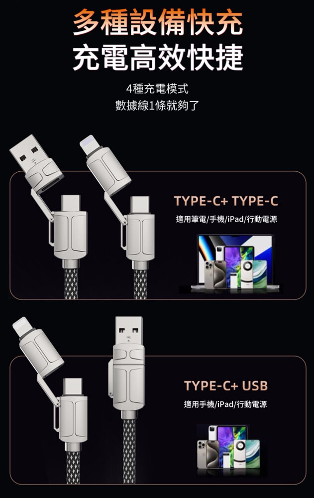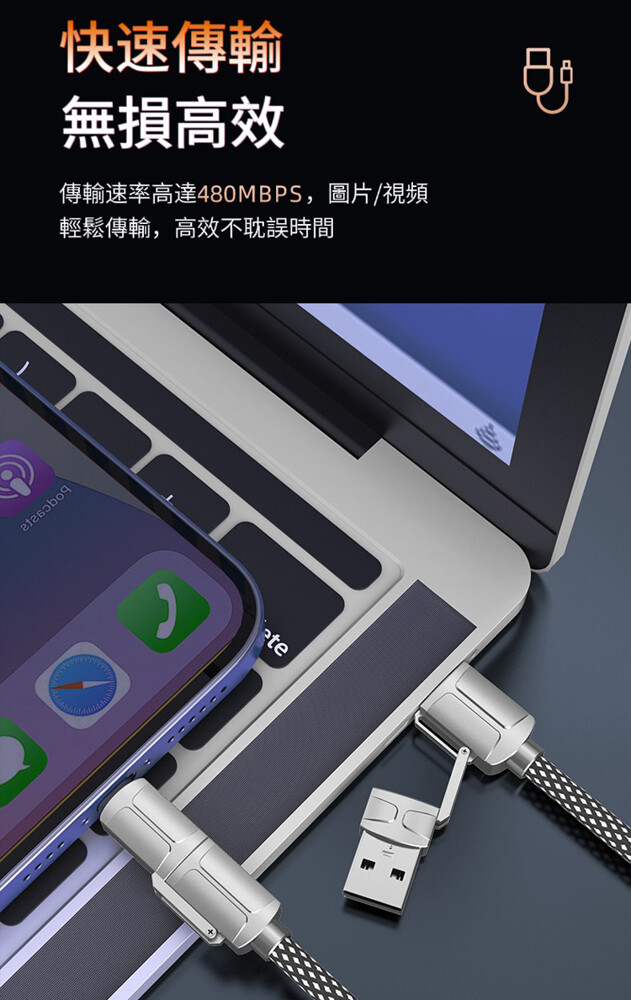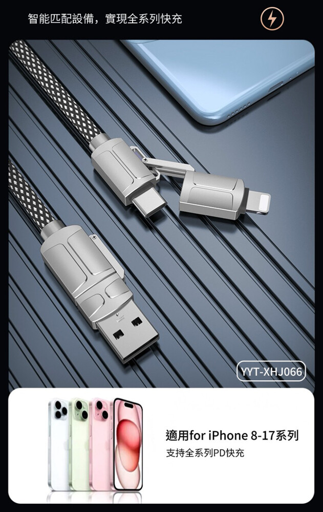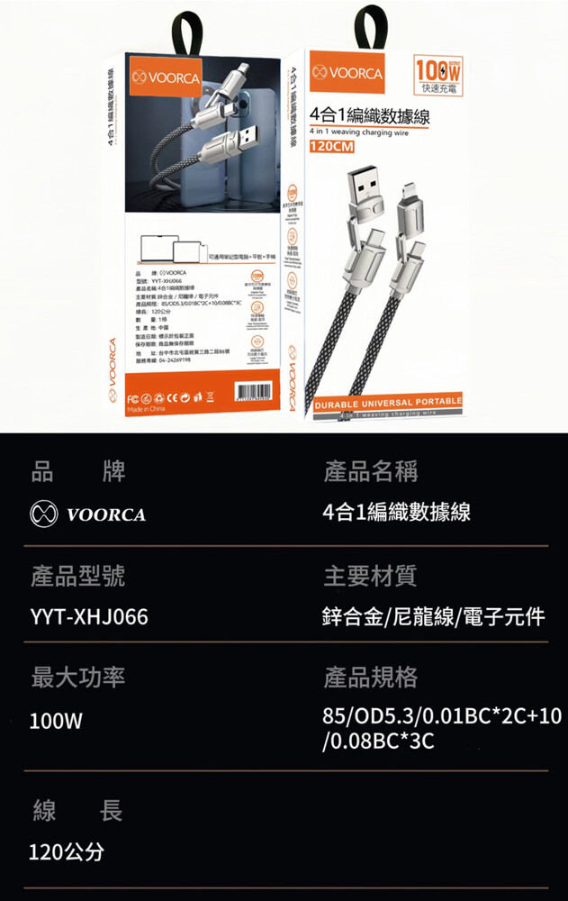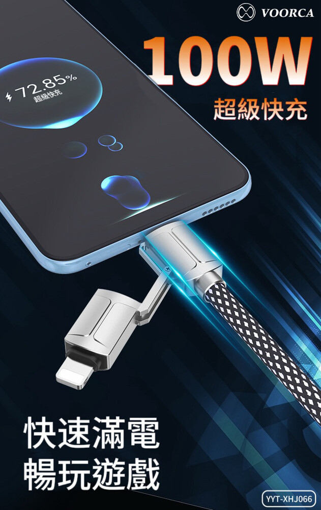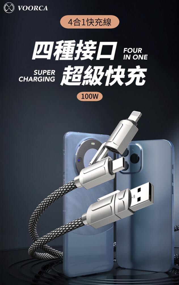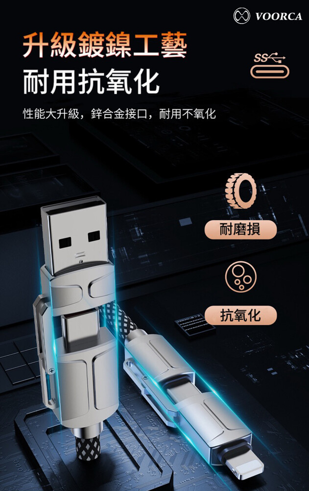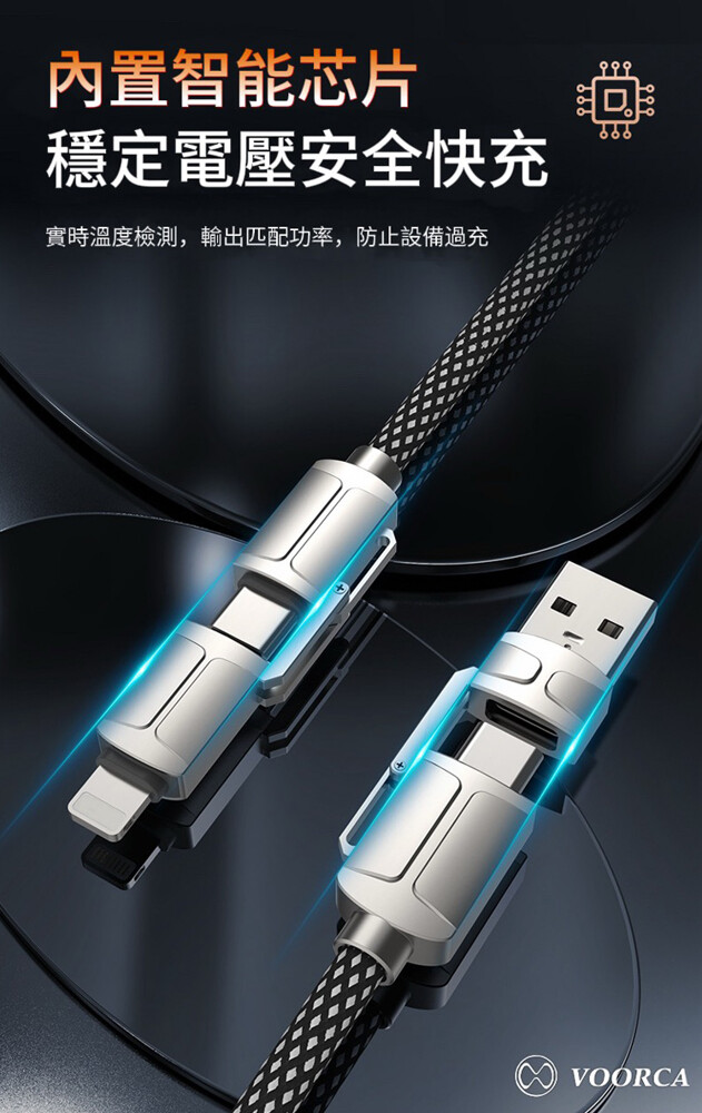 VOORCA YYT-XHJ066 4合1鋅合金Type-C/Lightning PD 100W充電傳輸線-120cm