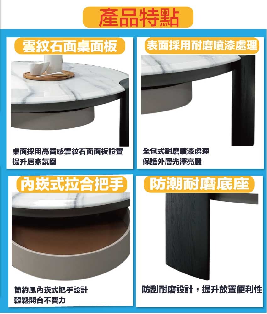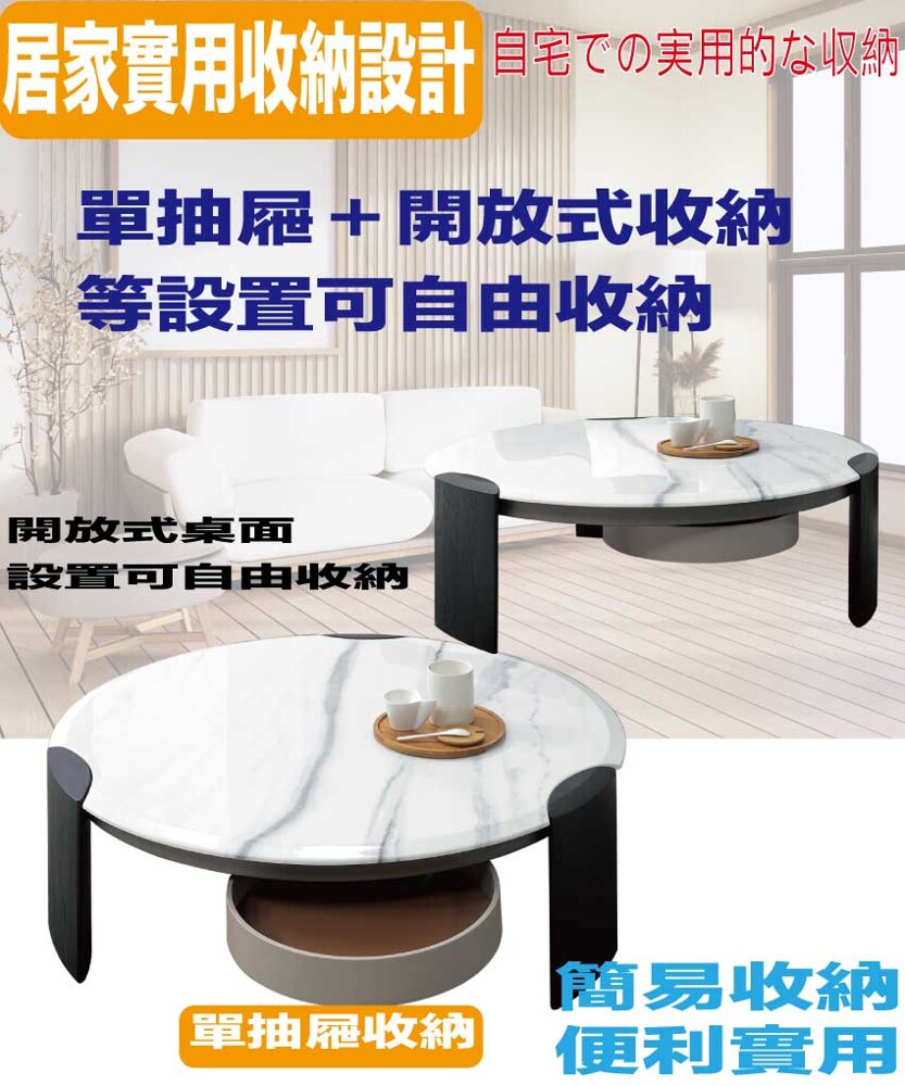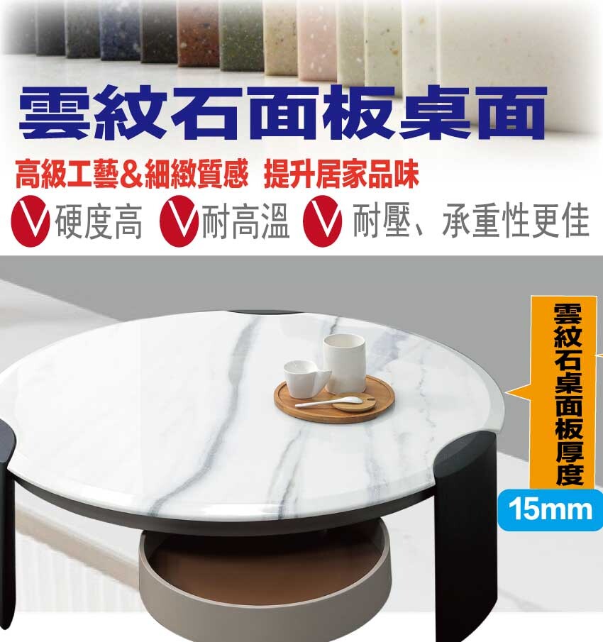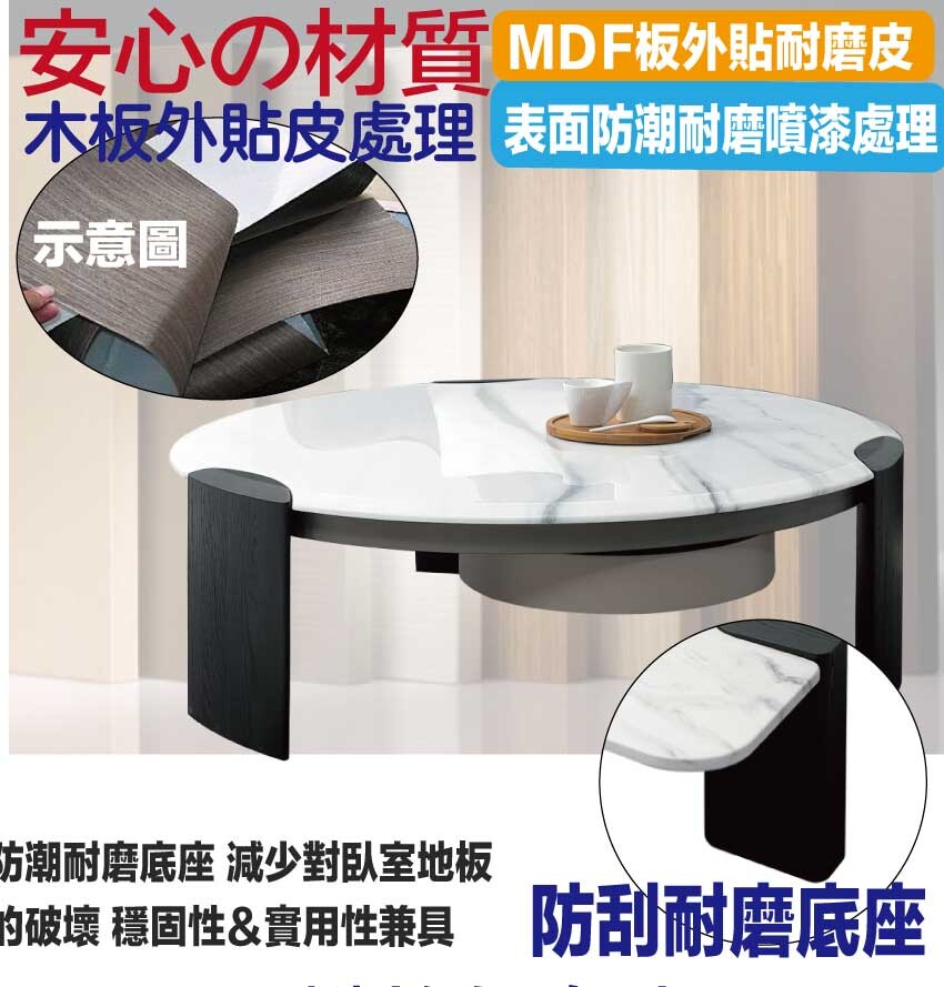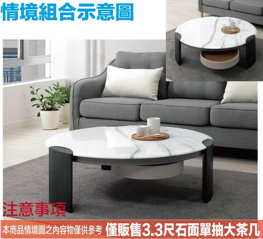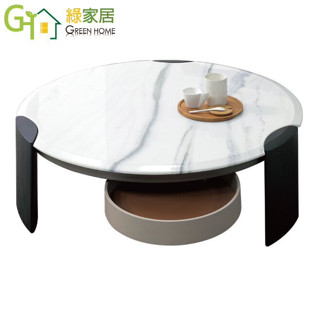 【綠家居】德奎爾3.3尺雲紋石面大茶几/圓几 現代雙色系+安心材質製造,使用放心+搭配居家更便利,採用防潮MDF板+防潮耐磨底座+15mm雲紋石面桌面板等安心材質製造 ,外層採用防潮耐磨噴漆處理搭配採用單抽屜+開放層格等收納空間設計,全由專人配送到家,專業安心服務,替你省下更多時間!