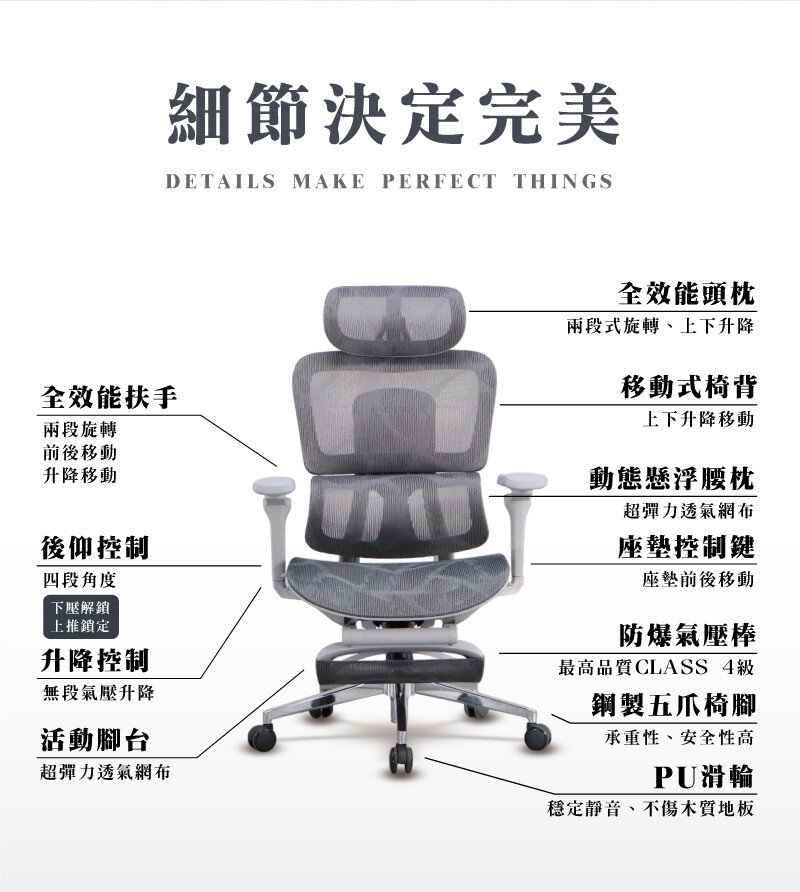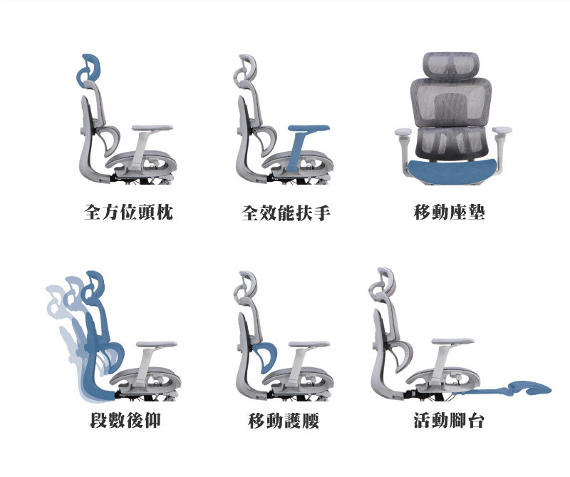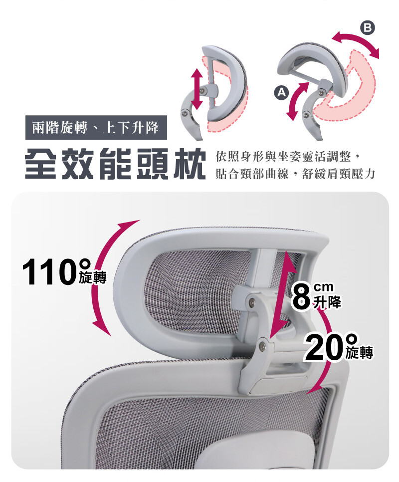 兩段式旋轉與上下調整,頭枕支撐頸椎,放鬆肩頸壓力,提升整體坐感舒適度。