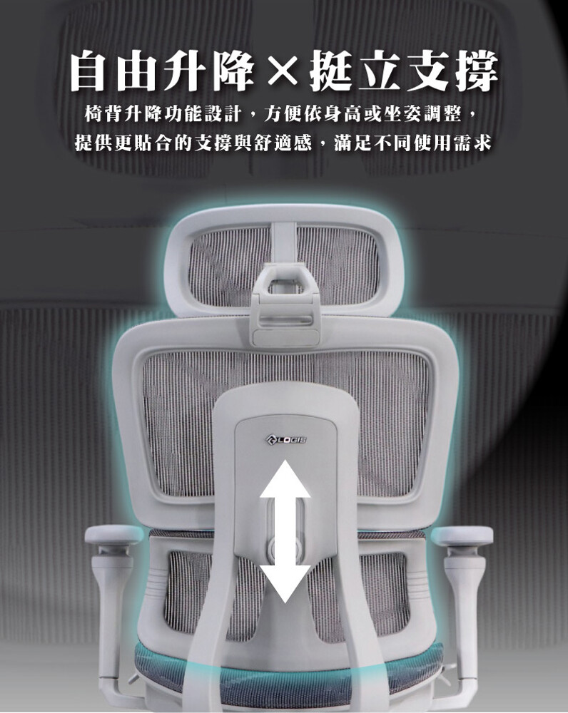 可隨身形變化自由升降,靈活調整椅背高度,給予完整包覆感。