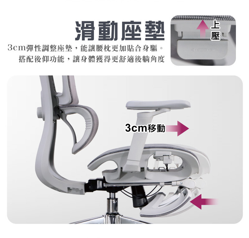 座墊可前後調整,提升腿部、臀部與腰部支撐感受。