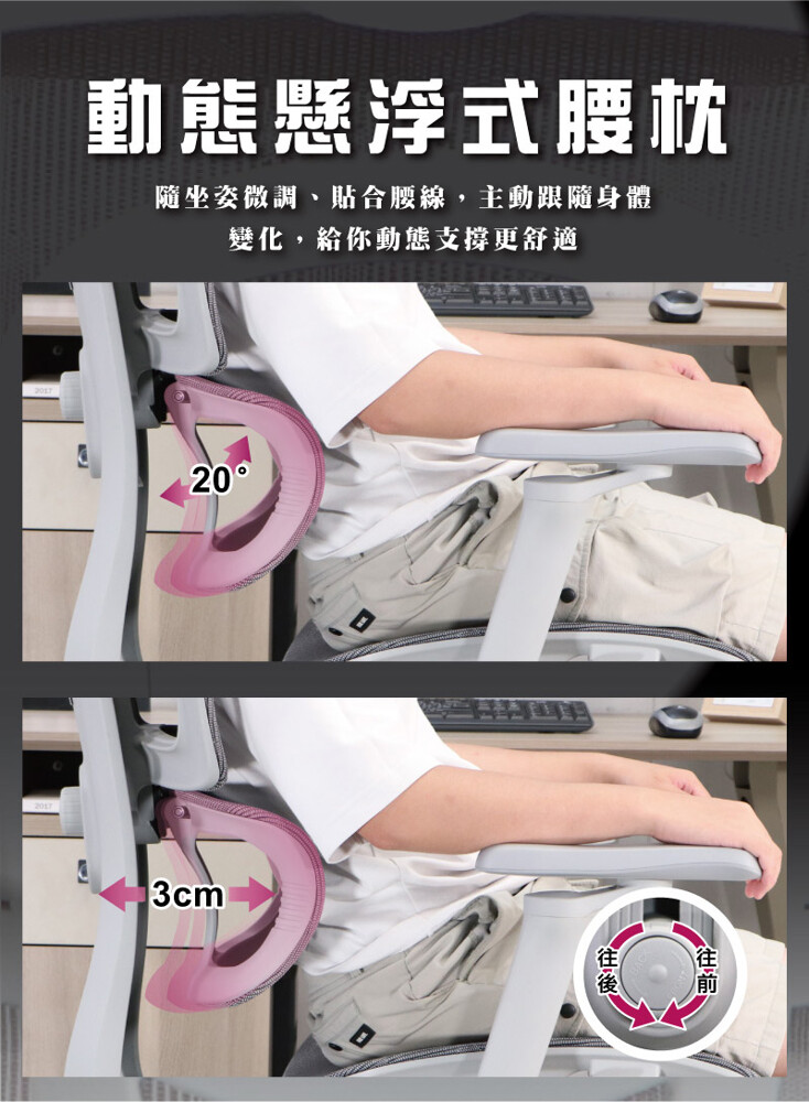 前後可移動設計,獨立於椅背,自動貼合腰部曲線,彈性調節支撐壓力。