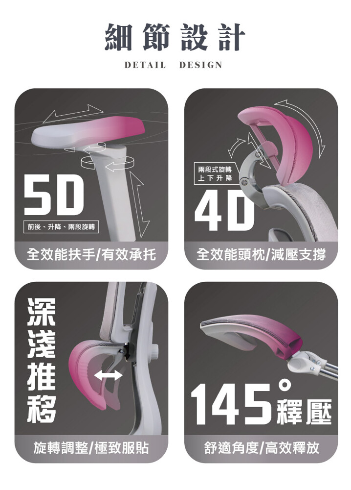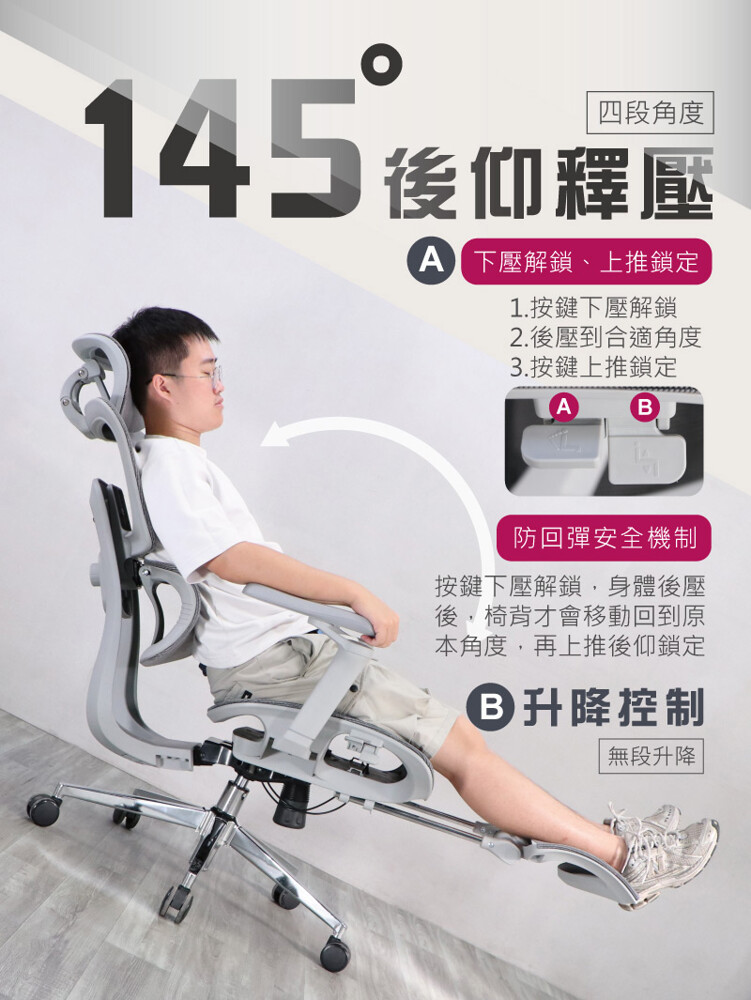多段角度選擇(最大145°),穩固後仰不卡頓;防回彈系統確保安全回彈不突兀。