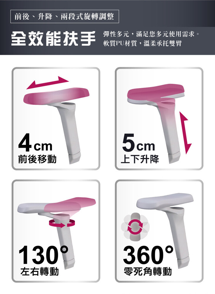 ■ 5D多功能扶手(前後移動/360度旋轉/130度左右轉動/升降)