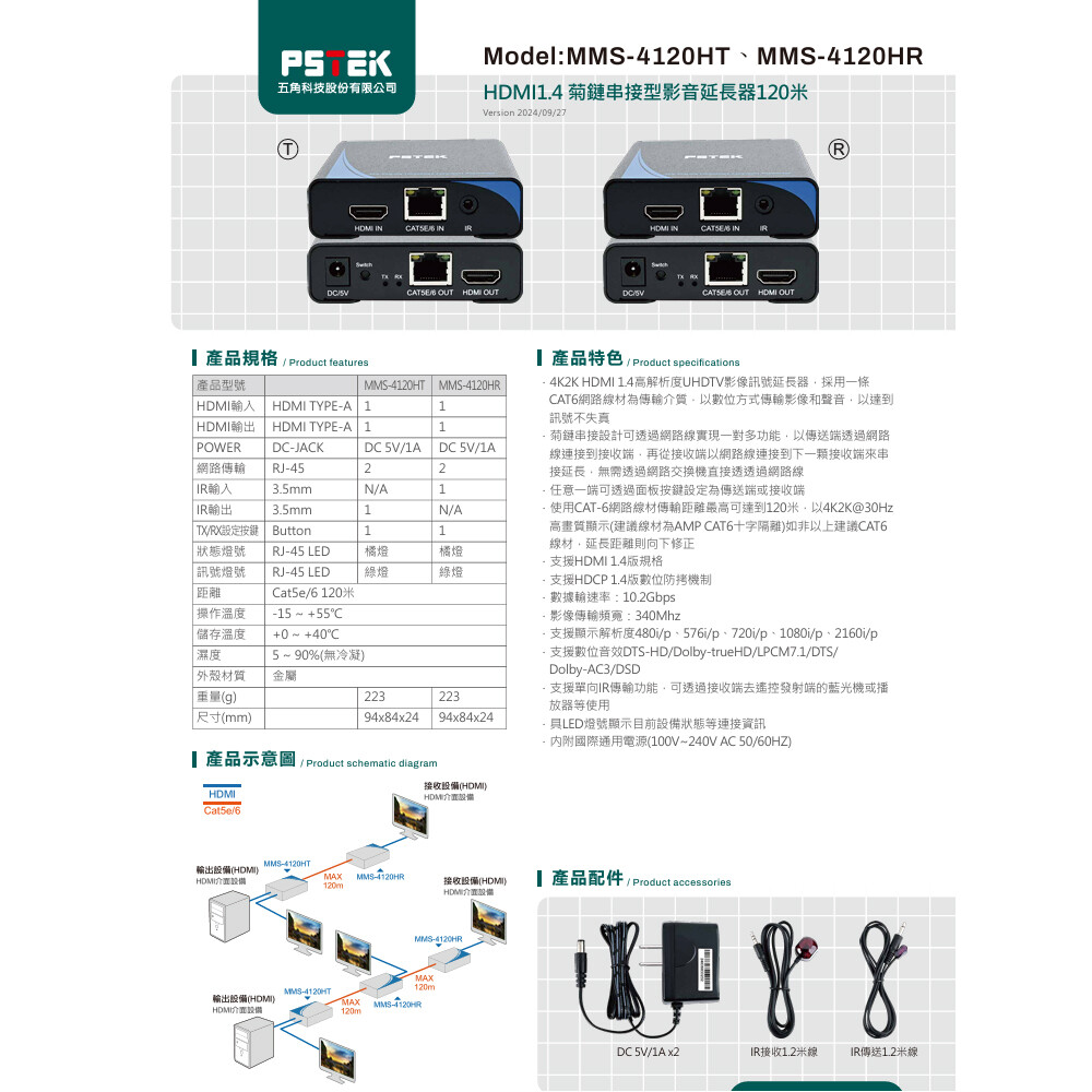 -使用CAT-6網路線材傳輸距離最高可達到120米,以4K2K@30Hz高畫質顯示(建議線材為AMP CAT6十字隔離)如非以上建議CAT6線材,延長距離則向下修正