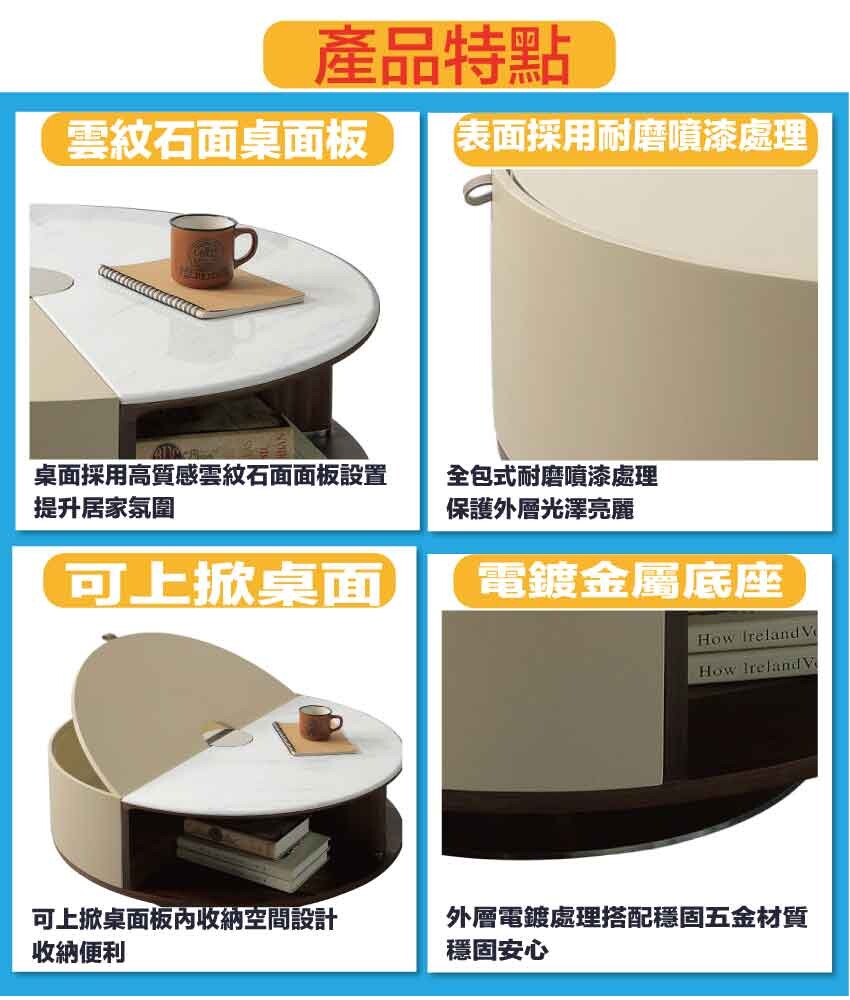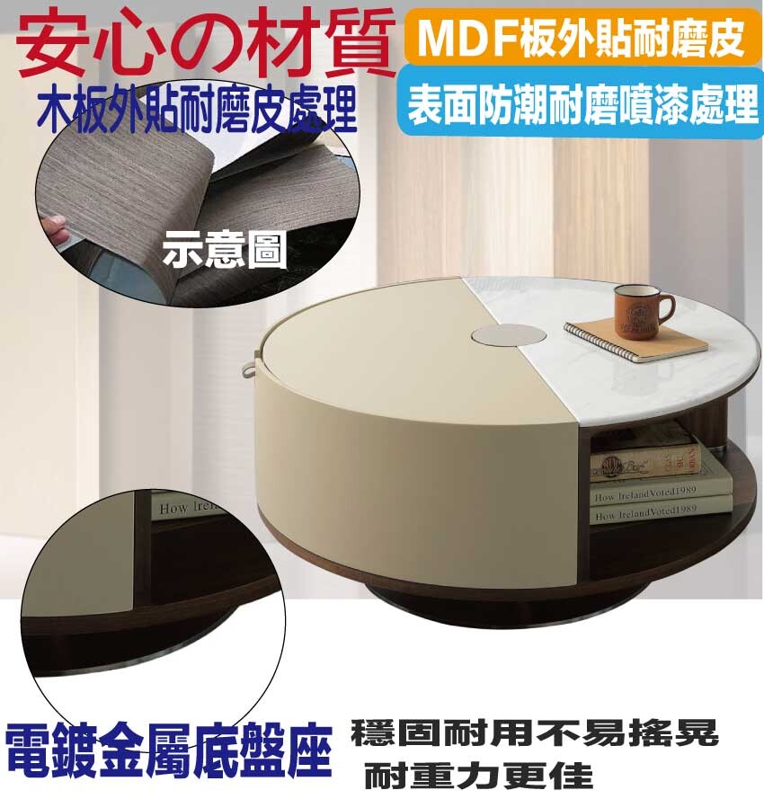 【綠家居】維可2.7尺雲紋石面旋轉大茶几/圓几 現代雙色系+安心材質製造,使用放心+搭配居家更便利,採用防潮MDF板+電鍍金屬底座+15mm雲紋石面桌面板等安心材質製造 ,外層採用防潮耐磨噴漆處理搭配採用可上掀桌面板+內&外開放層格+茶几可旋轉機能等收納空間設計,全由專人配送到家,專業安心服務,替你省下更多時間!