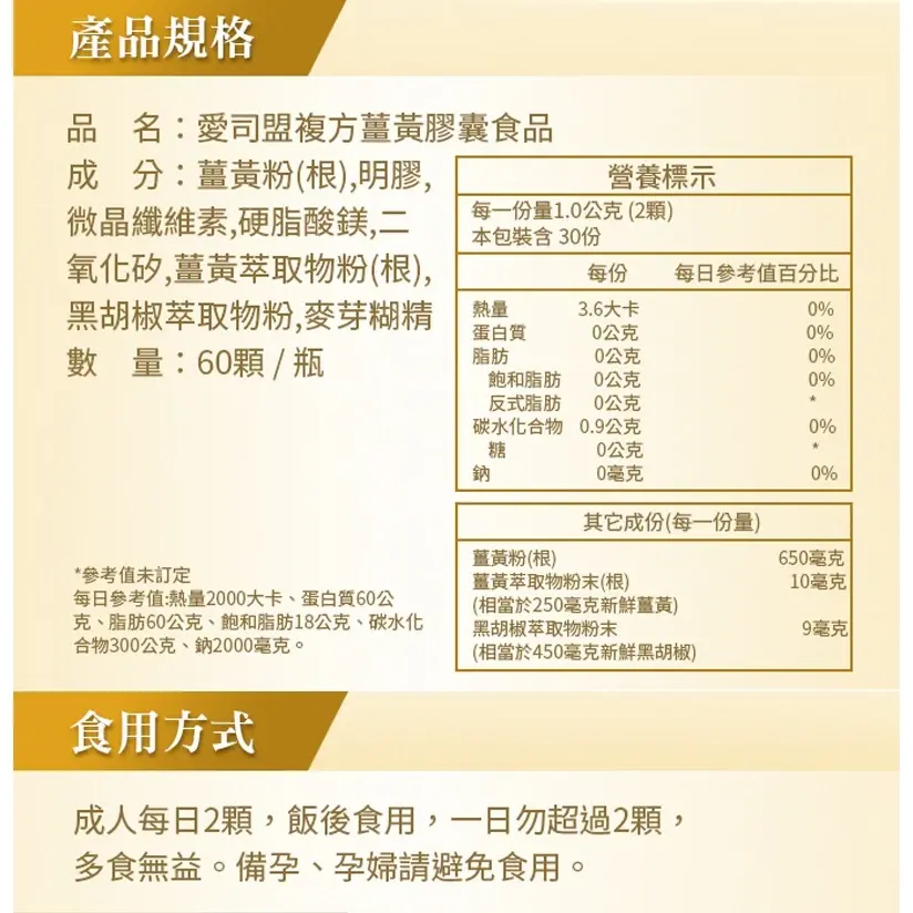 產品全名: 愛司盟複方薑黃膠囊食品