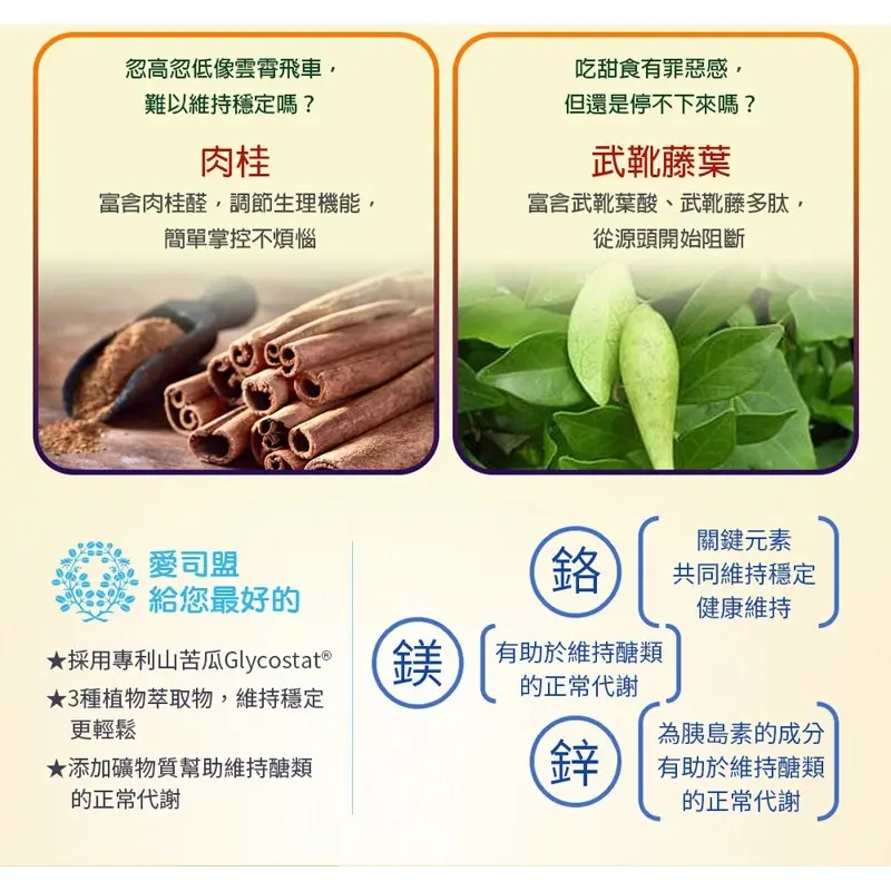 成份:山苦瓜萃取物,檸檬酸鎂,羥丙基甲基纖維素,麥芽糊精,微晶纖維素,鋅酵母,武靴藤葉萃取物,鉻酵母,肉桂10:1萃取物,硬脂酸鎂,二氧化矽,食用藍色1號,食用黃色4號。