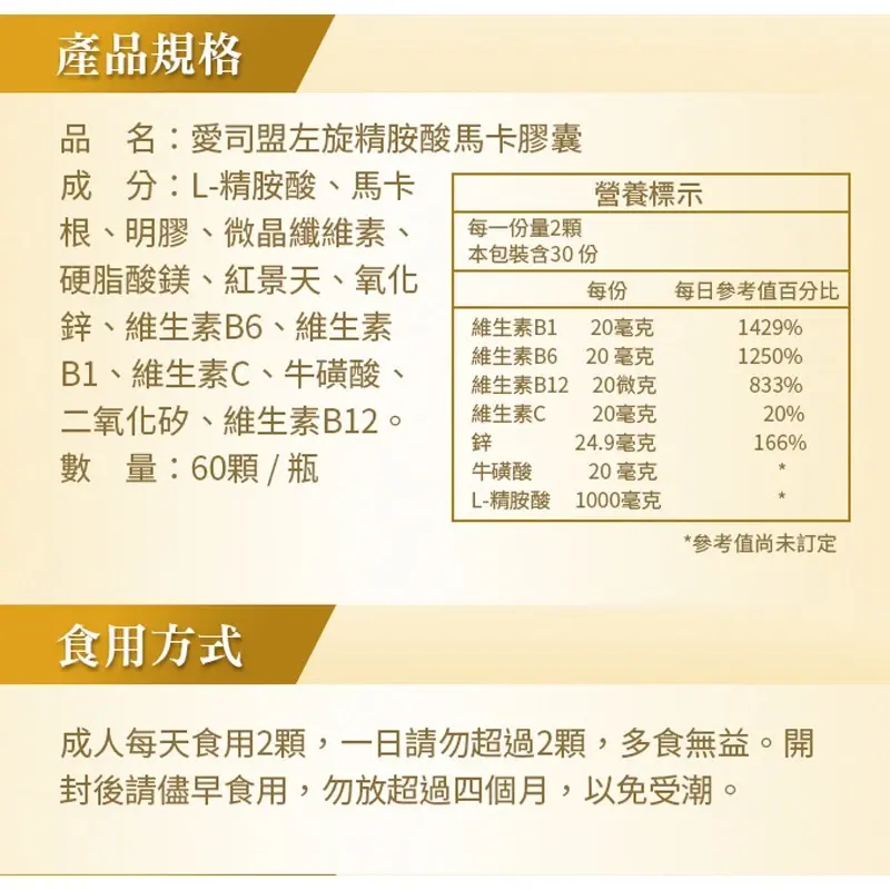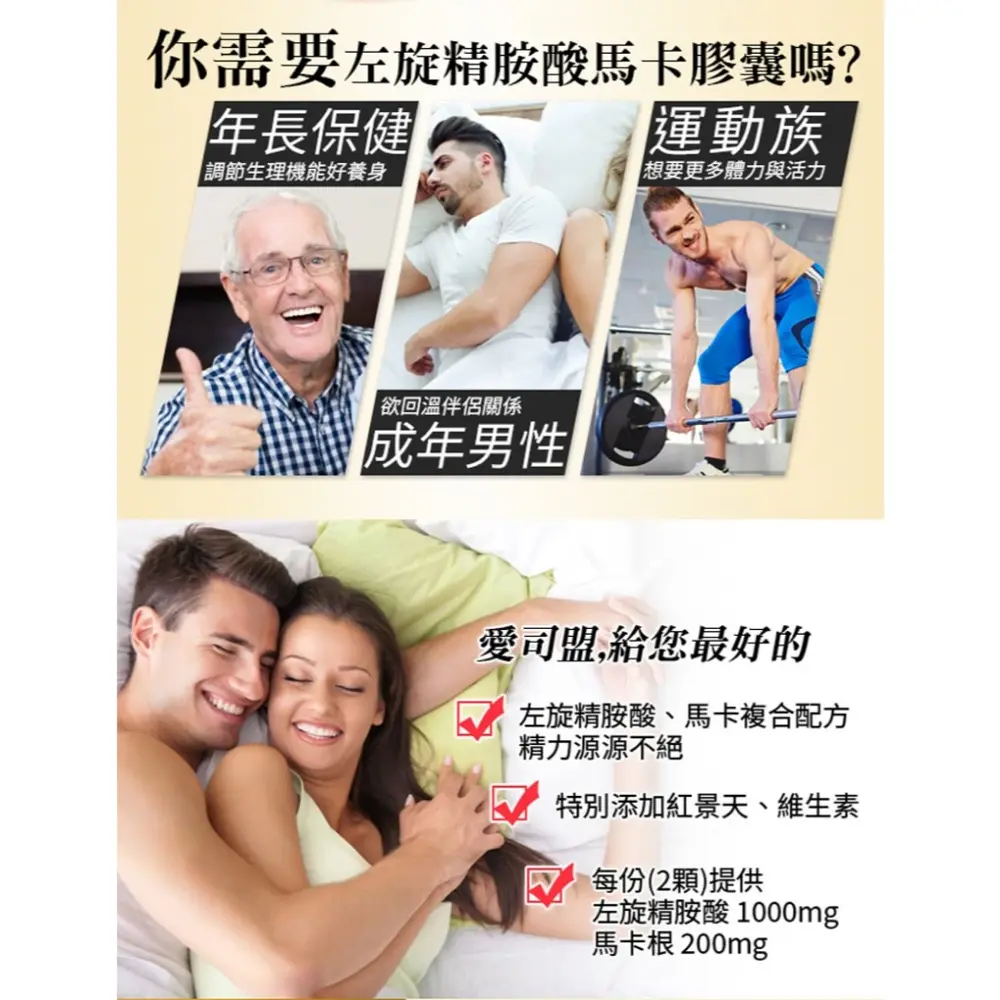 產品全名: 愛司盟左旋精胺酸馬卡膠囊
