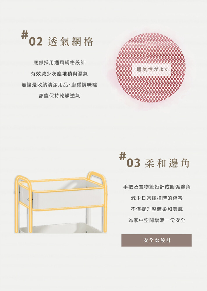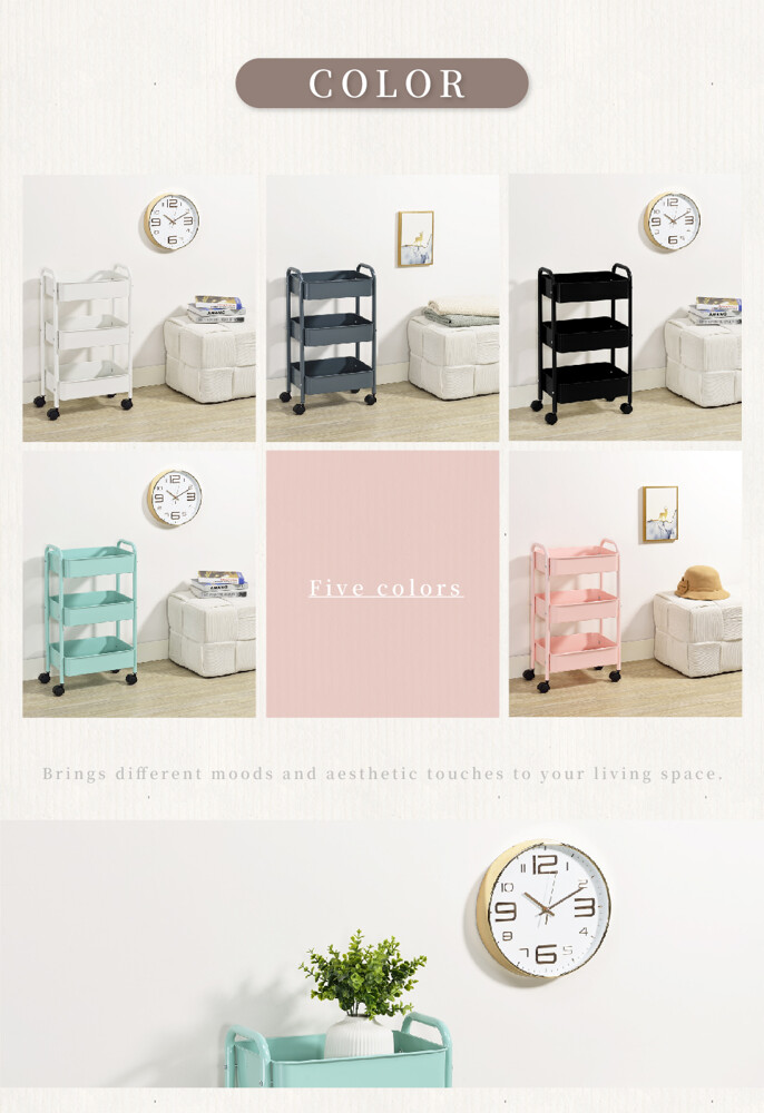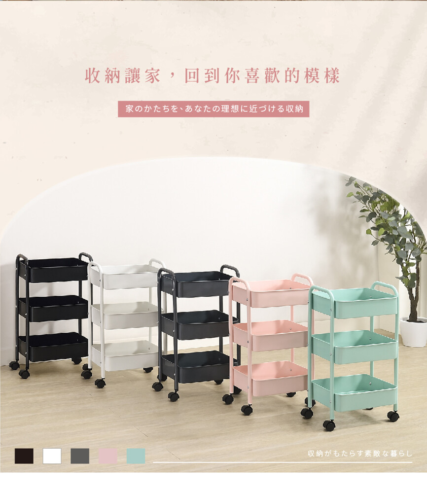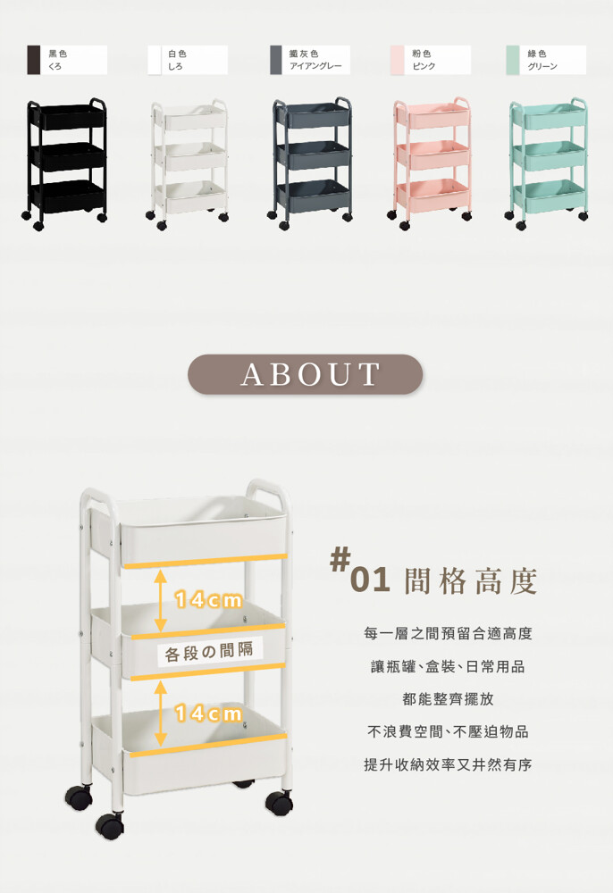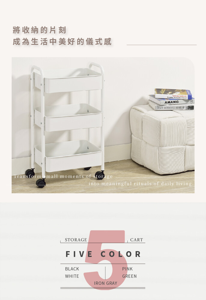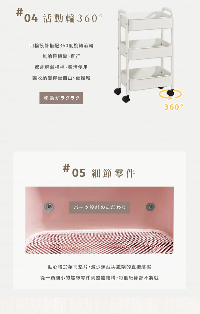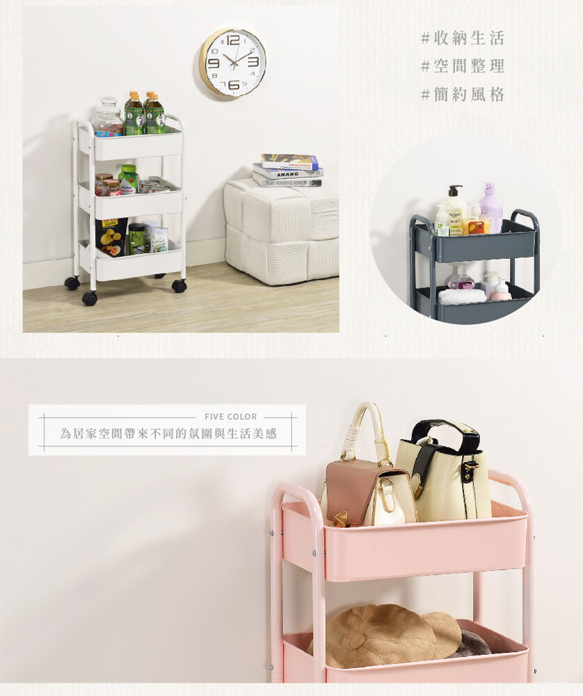 商品材質 : 烤漆鐵管、收納鐵籃、活動輪、塑膠配件