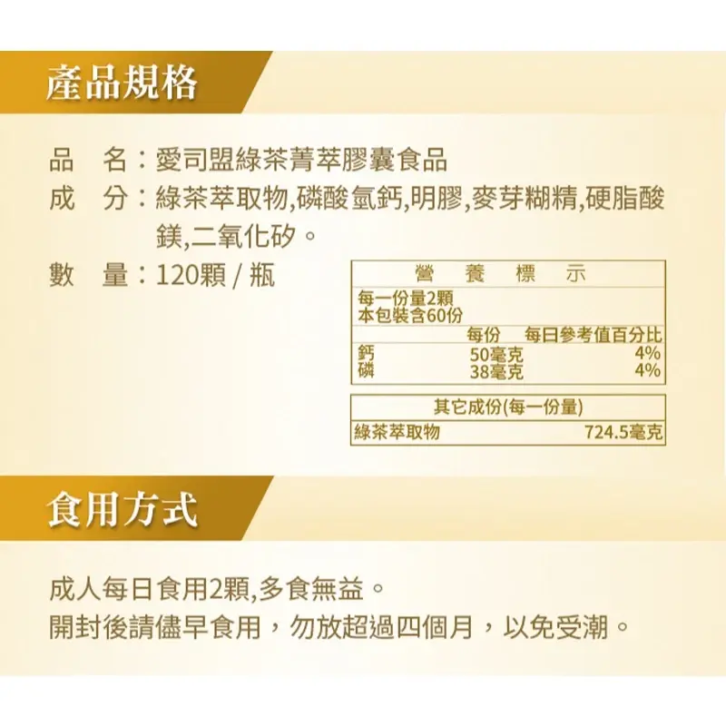 成份:綠茶萃取物、磷酸氫鈣、明膠、麥芽糊精、硬脂酸鎂、二氧化矽