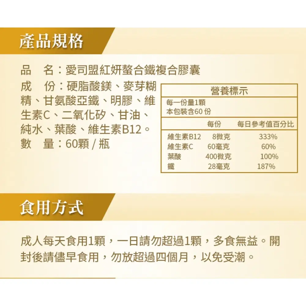 產品全名: 愛司盟紅妍螯合鐵複合膠囊