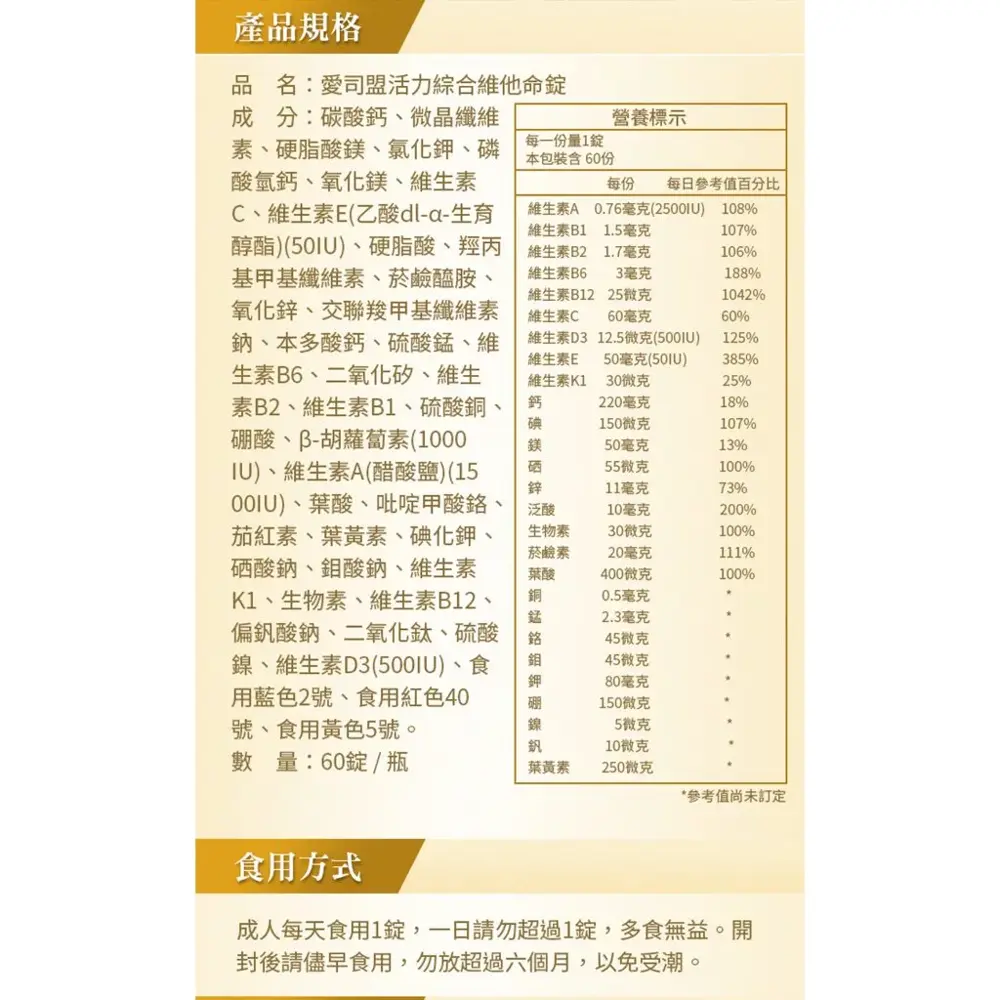 成份:碳酸鈣、微晶纖維素、硬脂酸鎂、氯化鉀、磷酸氫鈣、氧化鎂、維生素C、維生素E(乙酸dl-a-生育醇酯)(50IU)、硬脂酸、羥丙基甲基纖維素、菸鹼醯胺、氧化鋅、交聯羧甲基纖維素鈉、本多酸鈣、硫酸錳、維生素B6、二氧化矽、維生素B2、維生素B1、硫酸銅、硼酸、b-胡蘿蔔素(1000IU)、維生素A(醋酸鹽)(1500IU)、葉酸、吡啶甲酸鉻、茄紅素、葉黃素、碘化鉀、硒酸鈉、鉬酸鈉、維生素K1、生物素、維生素B12、偏釩酸鈉、二氧化鈦、硫酸鎳、維生素D3(500IU)、食用藍色2號、食用紅色40號、食用黃色5號。